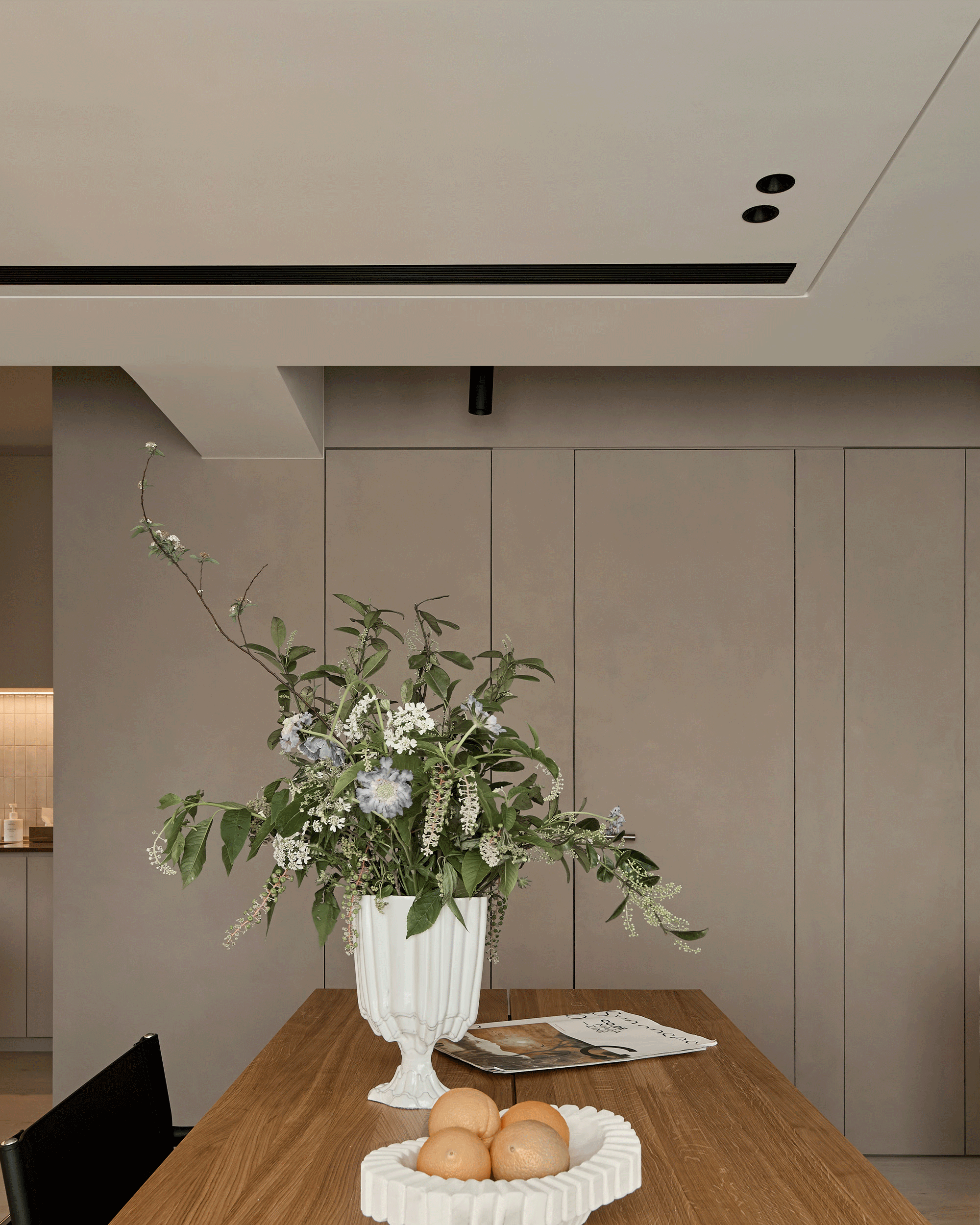 餐廳區與臥室之間,一道樺木色收納櫃牆有節奏地展開視覺軸線,不僅明確劃分公私領域,更作為屋主生活品味的延伸;開放的展示層架承載著珍愛的收藏藝術品與旅行回憶,讓家的故事在物件之間緩緩鋪展,靜靜流露居者的生活品味。