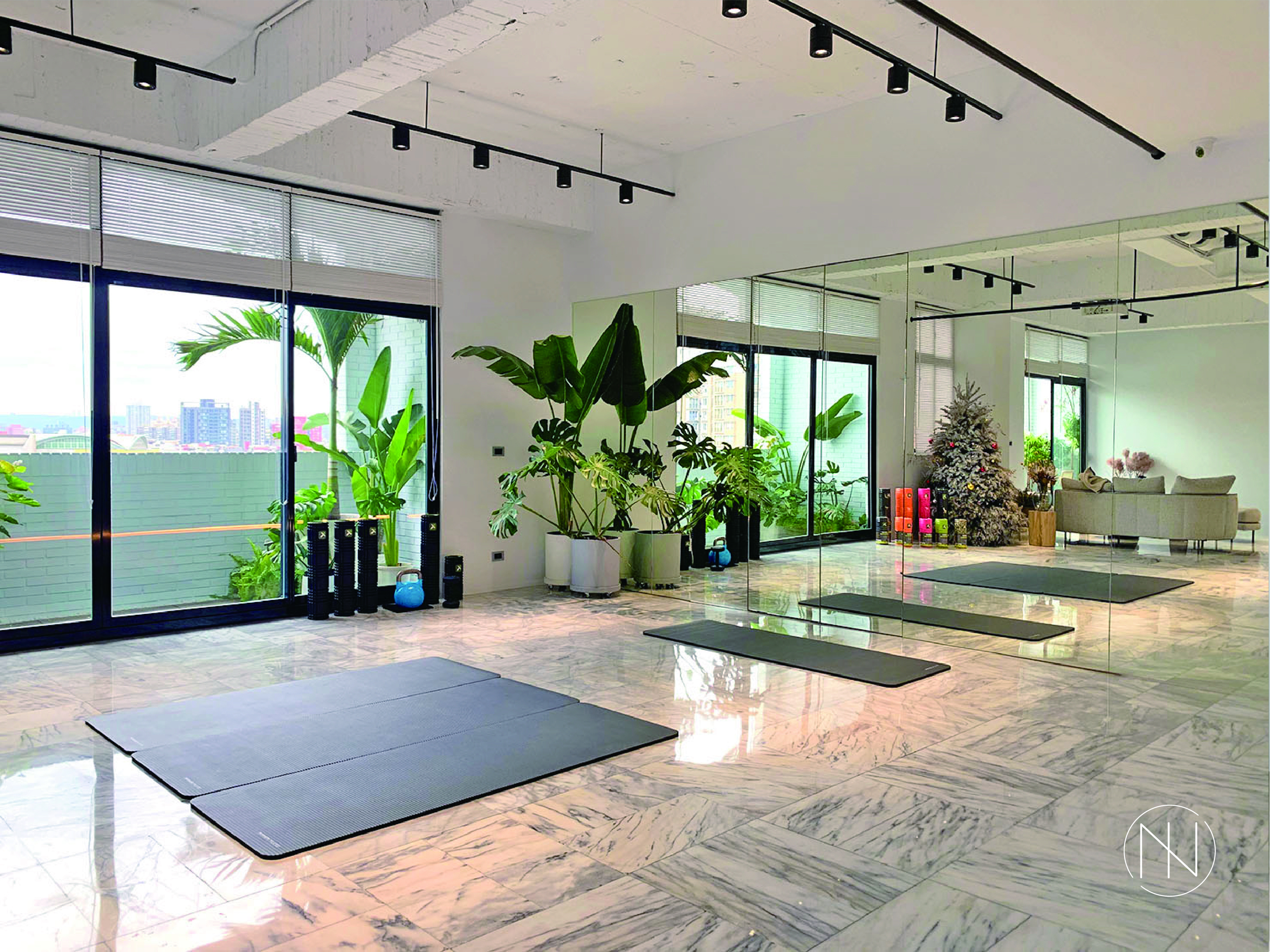 客戶運動授課的空間規劃了整座牆面的落地鏡設計,