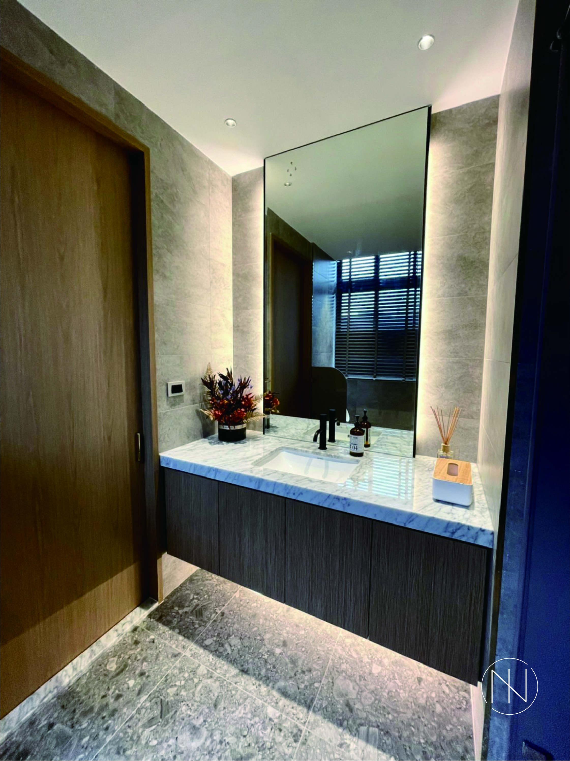牆面則以相同調性但質感略微不同的石材去製作,