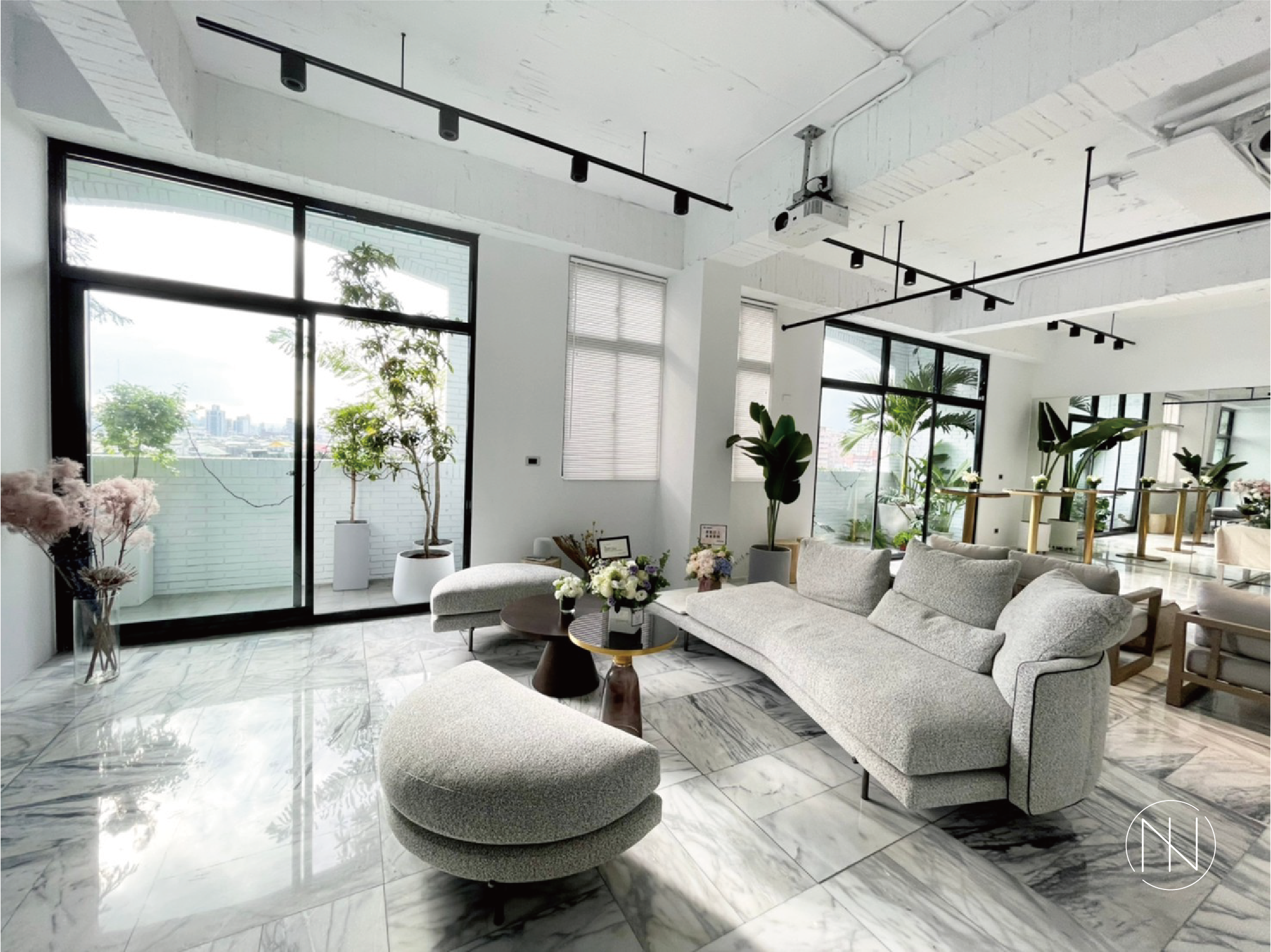 在各區域裡也利用植栽花藝去做點綴,洗練的現代風格與自然氣息的結合,