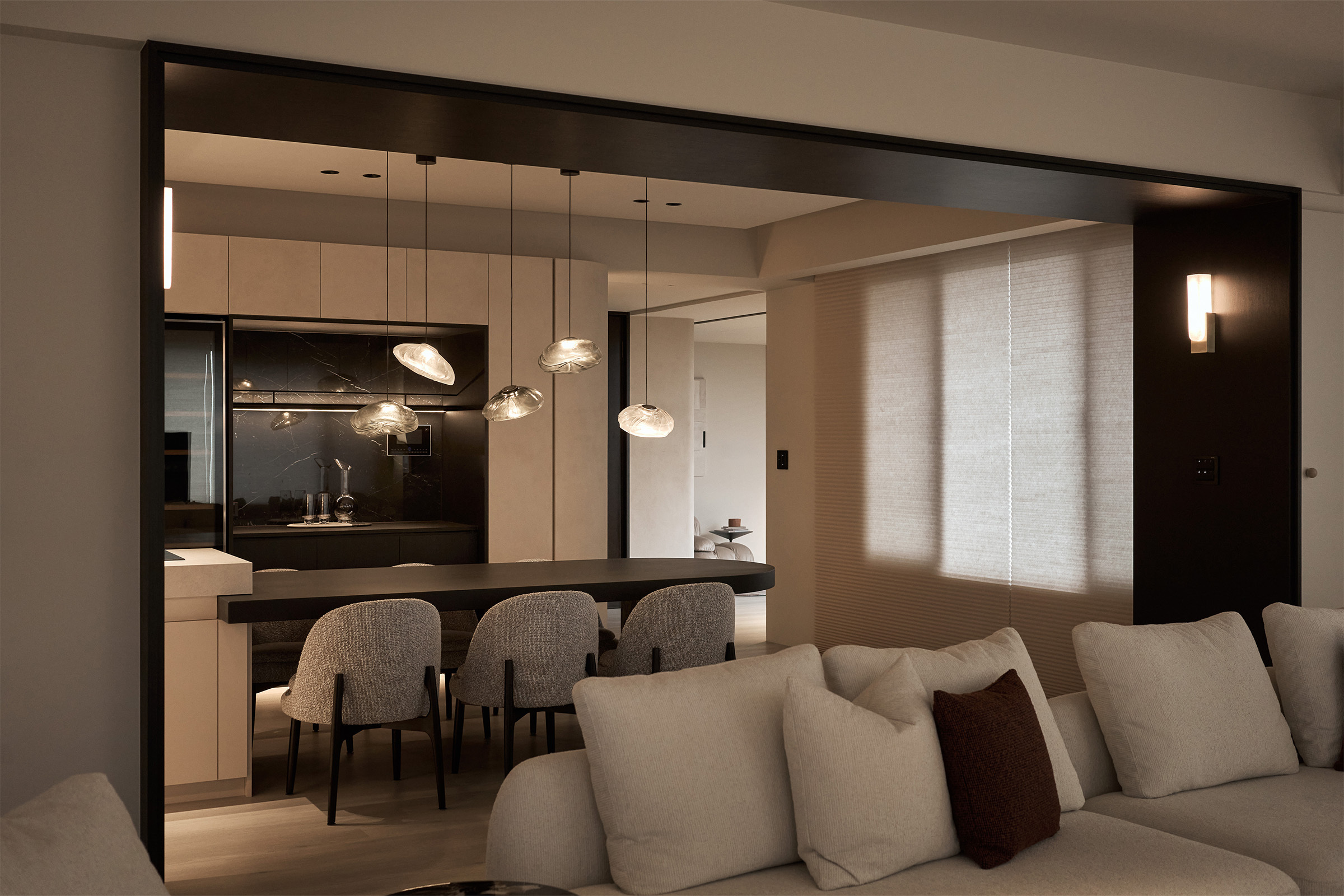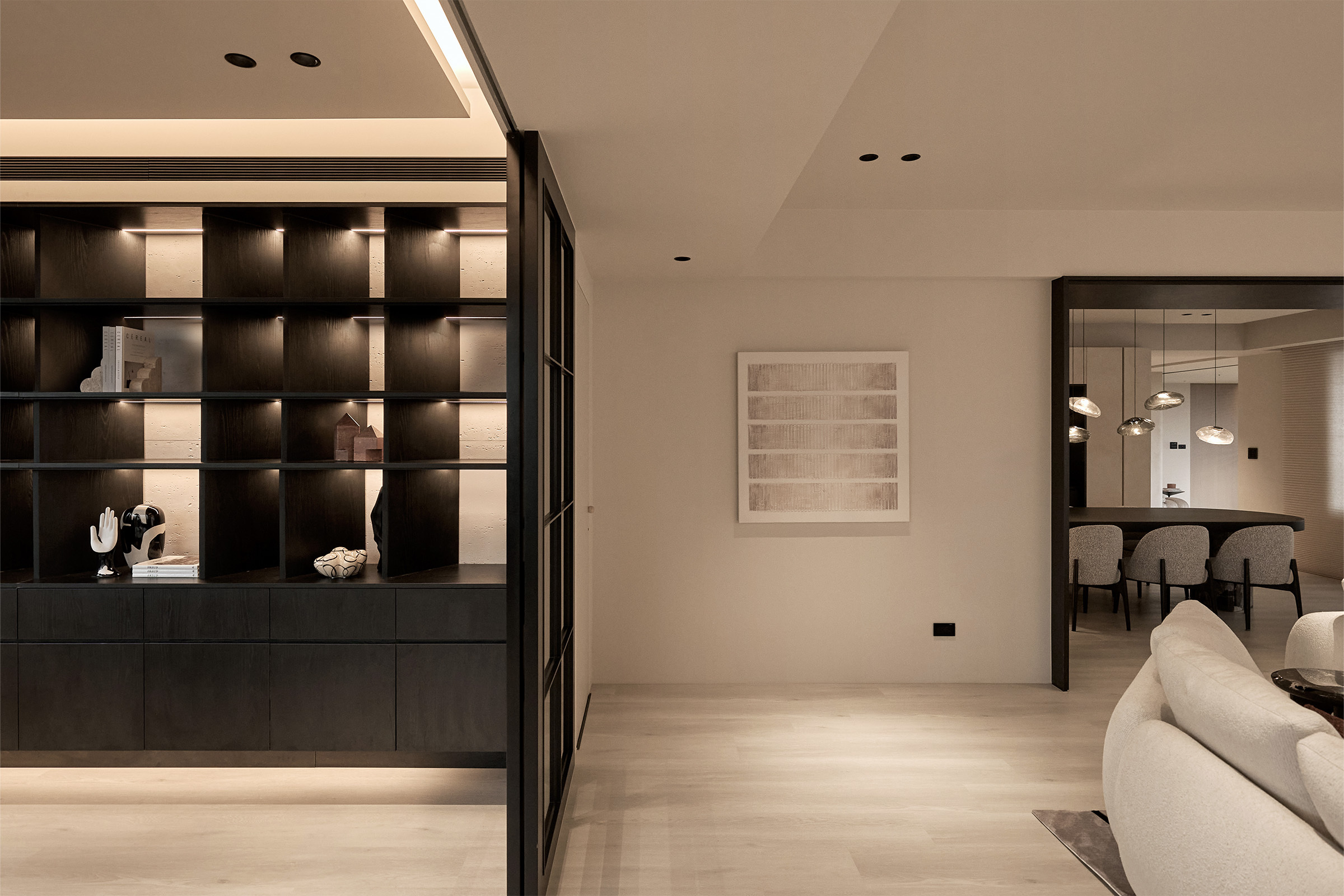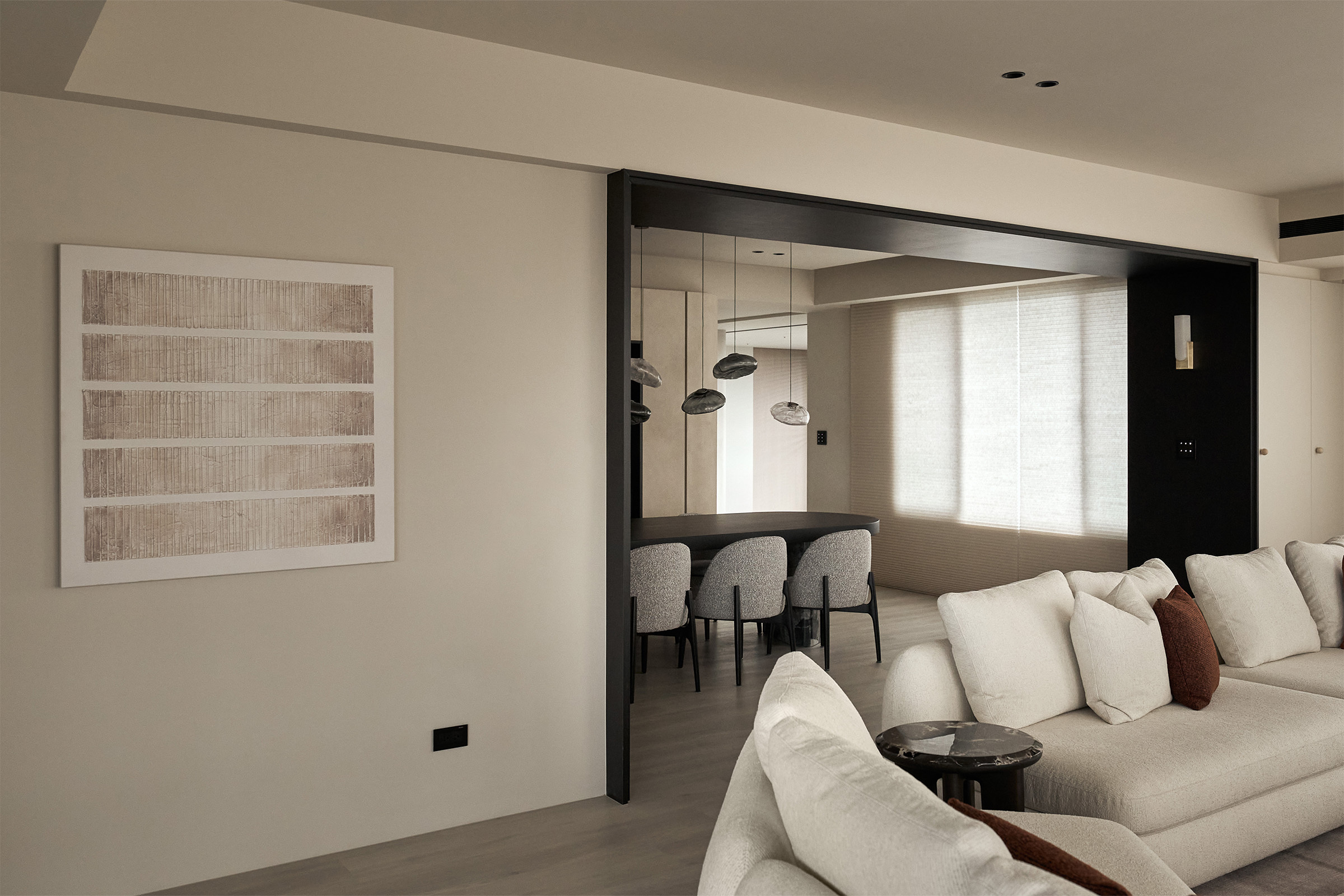 餐廳與客廳間黑色胡桃木的ㄇ型門框,如過道般輕輕劃下空間的邊界,將格局分隔得清晰卻不生硬,營造出開放又精緻的空間氛圍。