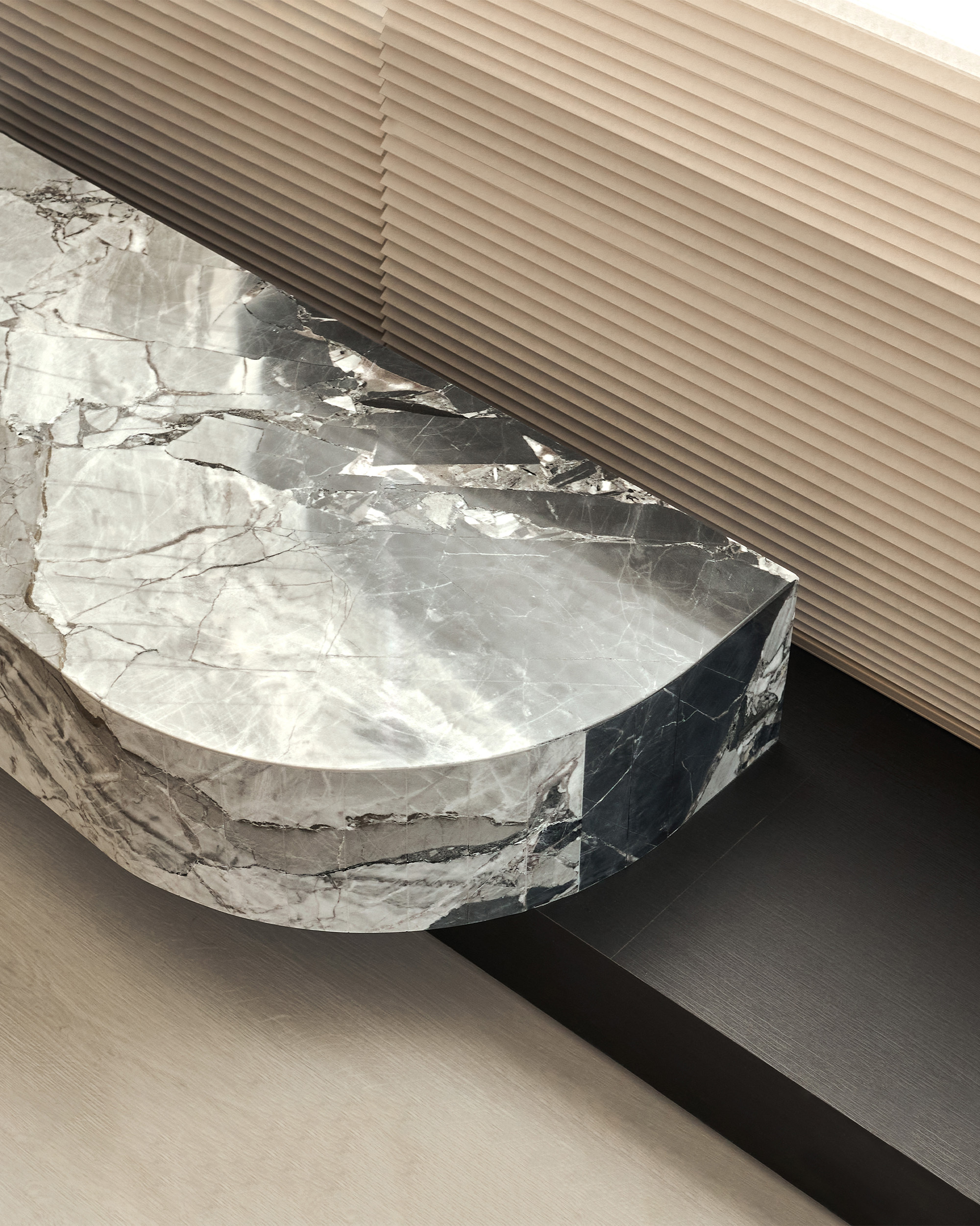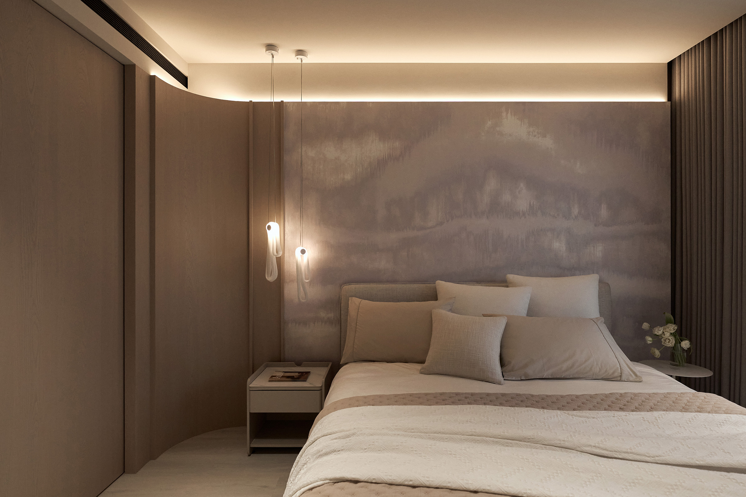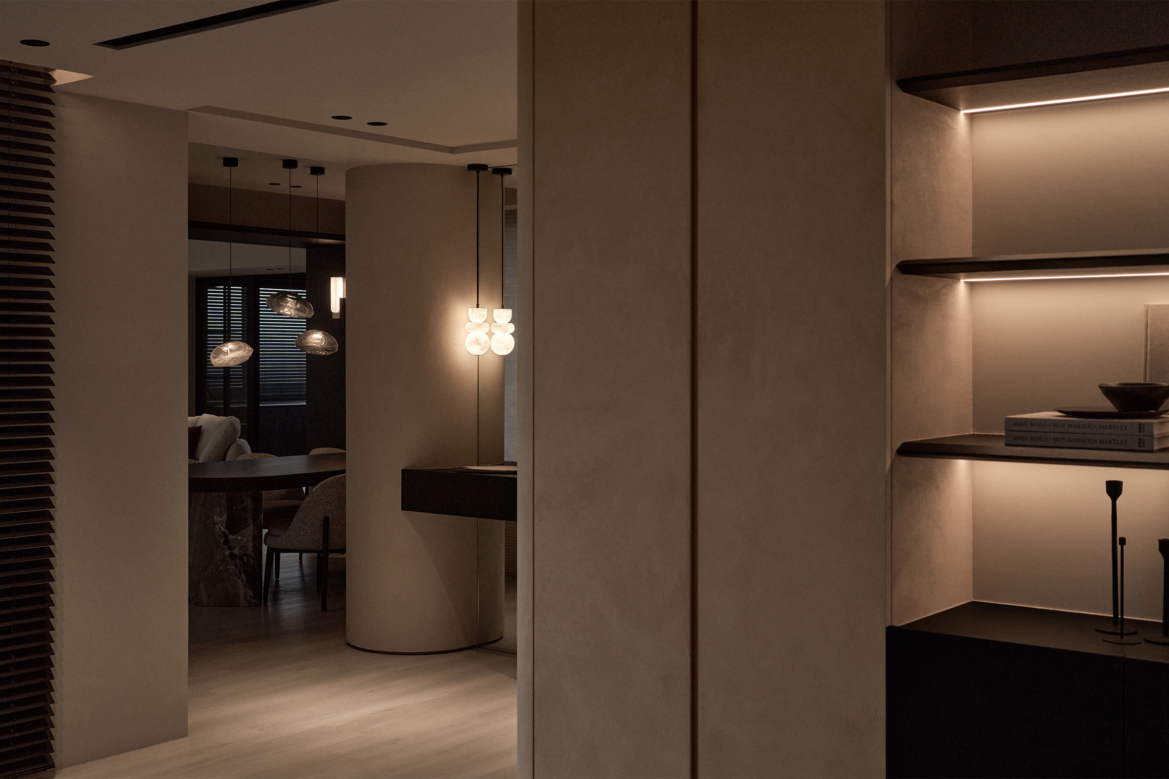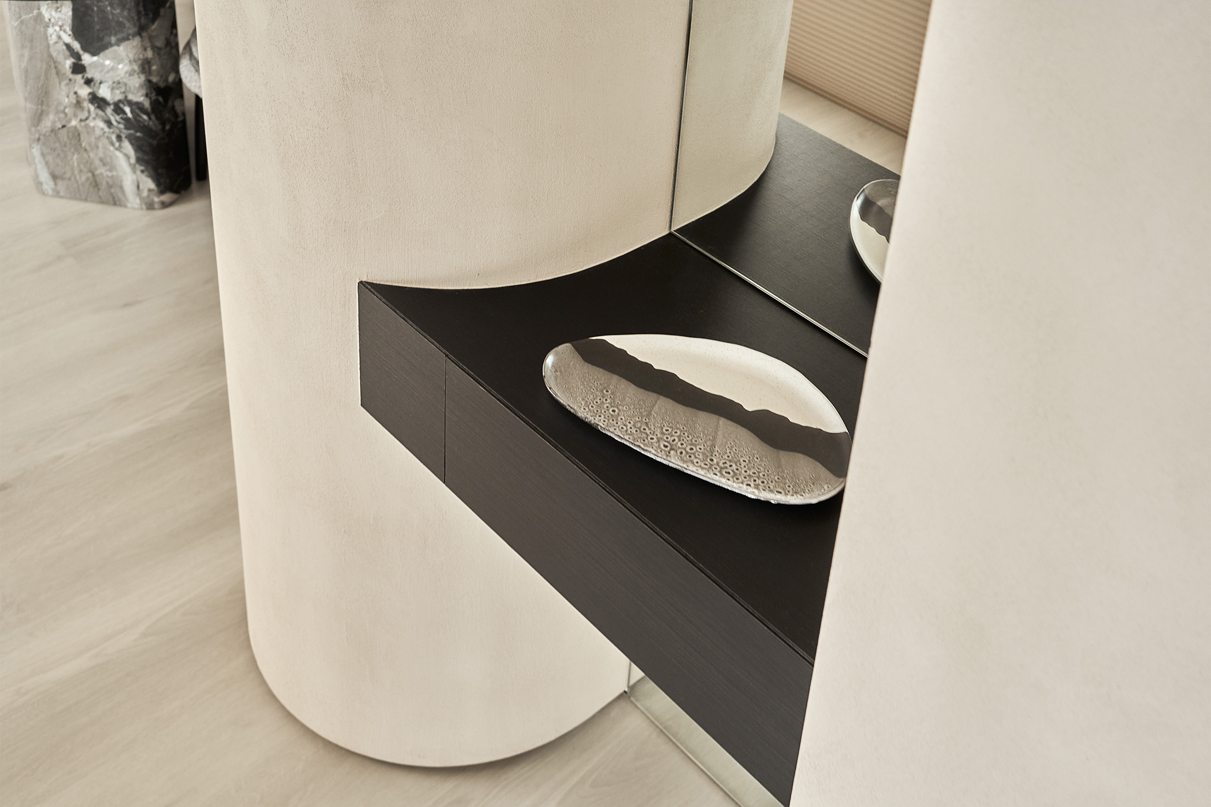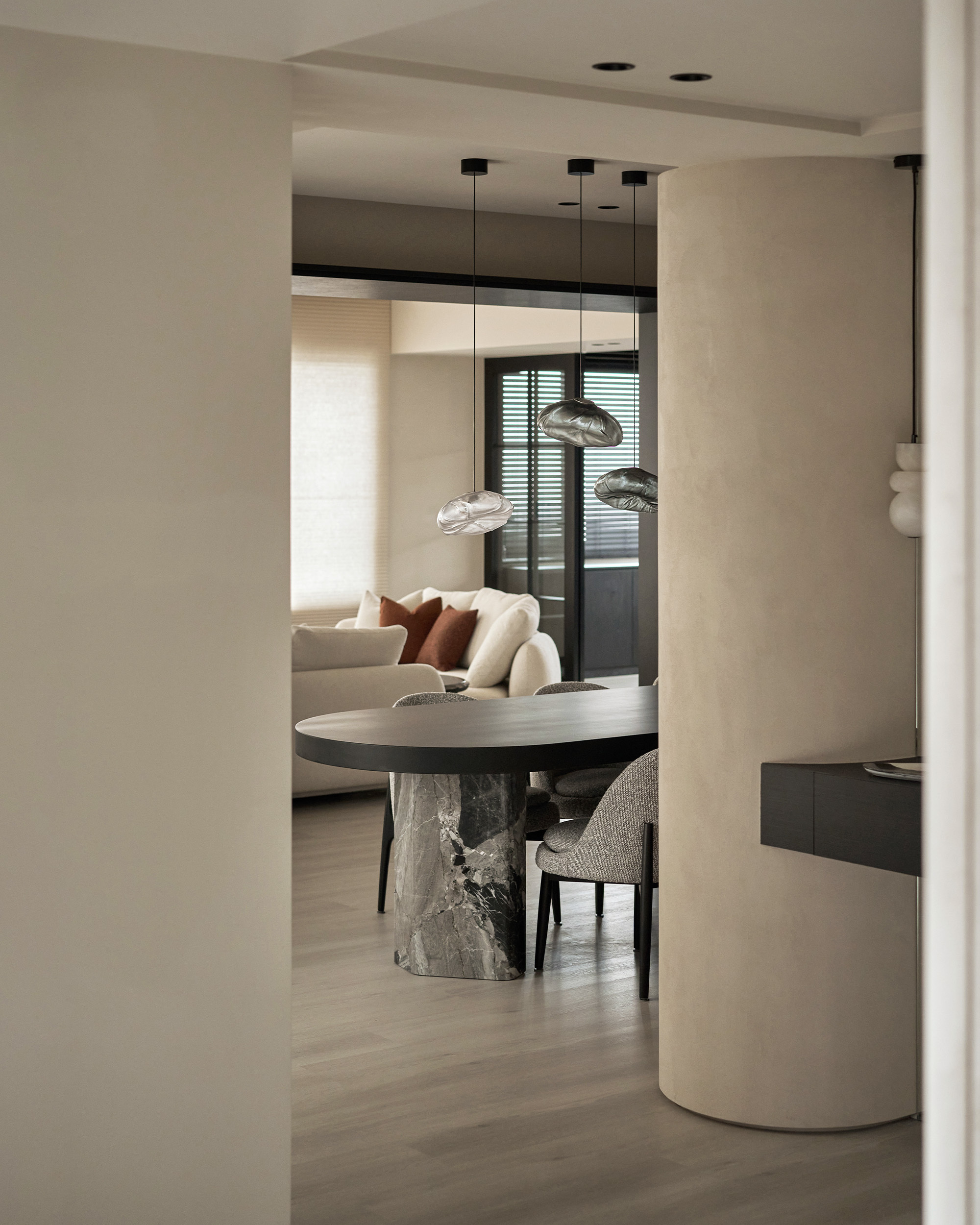 玄關以比利時礦物塗料覆蓋鞋櫃櫃面,散發天然高級質感,融合弧形櫃體柔化了硬朗的空間輪廓,穿衣鏡映出雲石吊燈的流轉光影,勾勒出一幅溫潤雅致的迎賓空間,以柔和的圓弧線條與軟裝搭配修飾空間的銳角,讓視覺流動得更為自然。