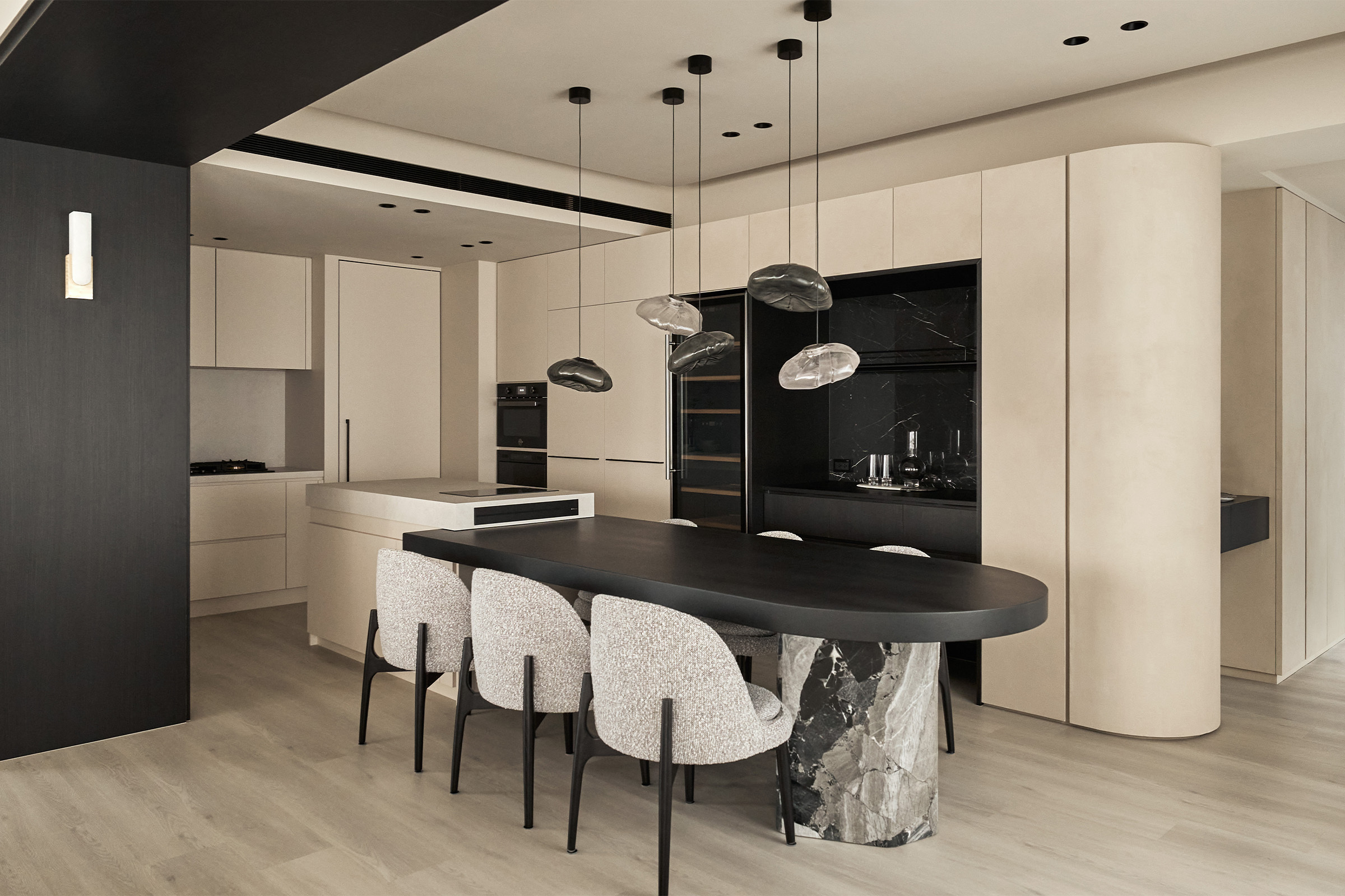 搭配使用動線將酒櫃、餐邊櫃與嵌入式冰箱,融合在廚房的 L 型檯面與中島間,豐富每一次的相聚,讓廚房與餐廳不僅是生活的中心,更是歡聚與故事的起點。