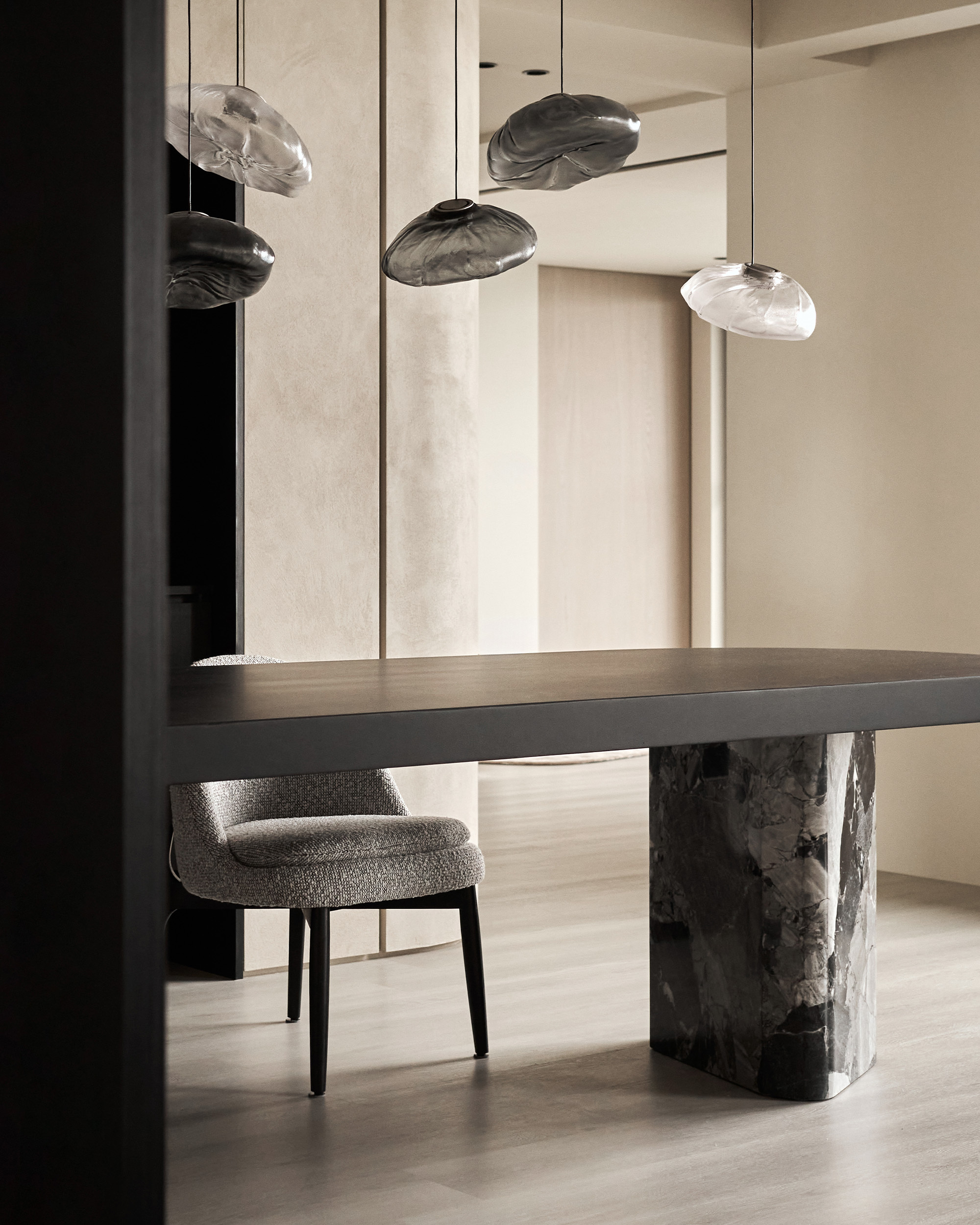 好客的屋主常邀請親朋好友到家裡聚會,寬敞的桌面承載的不只是美食與杯盞交錯,溫暖情誼從中島銜接的長餐桌延展,幾何大理石桌腳如雕刻般靜靜守候。