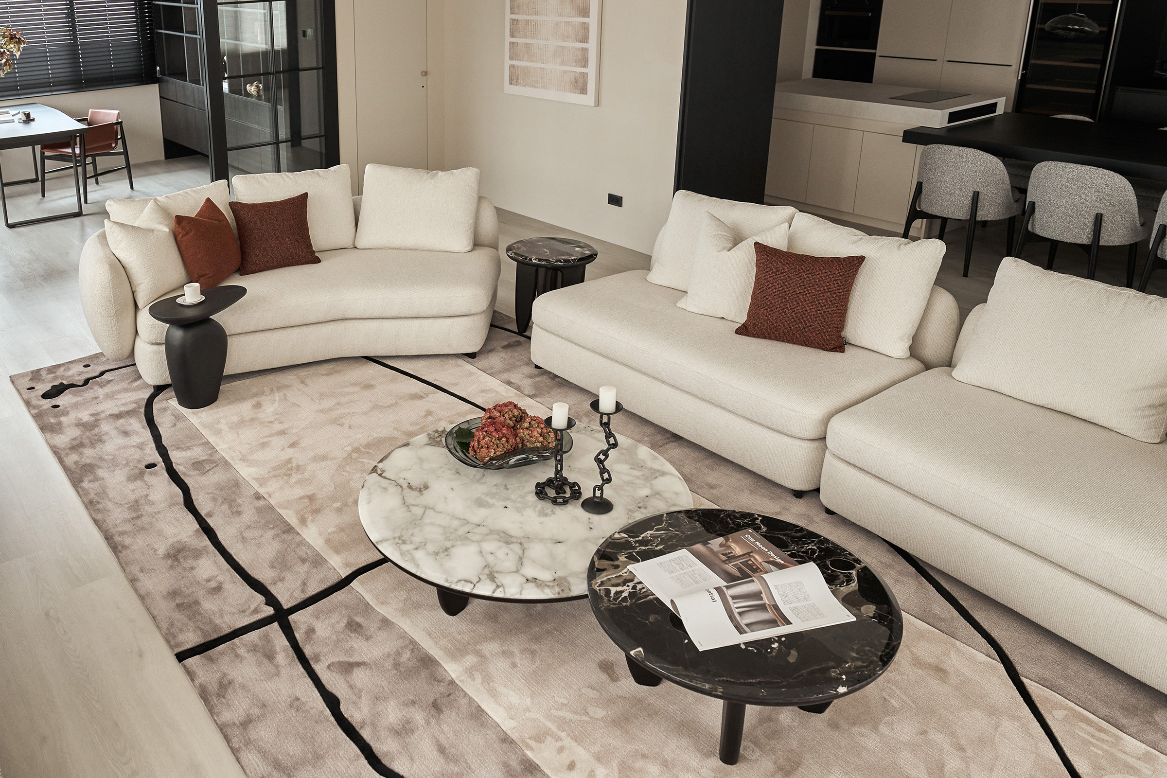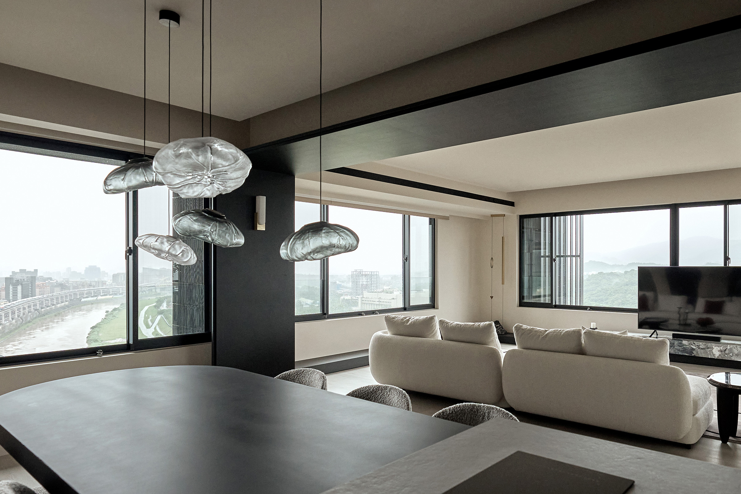 空間,是情感的容器;光影,是生命的韻律,俯瞰河景的大宅中,黑色的沉穩與Beige Color 的溫潤,塑造出大氣又內斂的居家場域,如一幅濃墨淡彩的藝術品,為空間賦予獨特的性格張力。