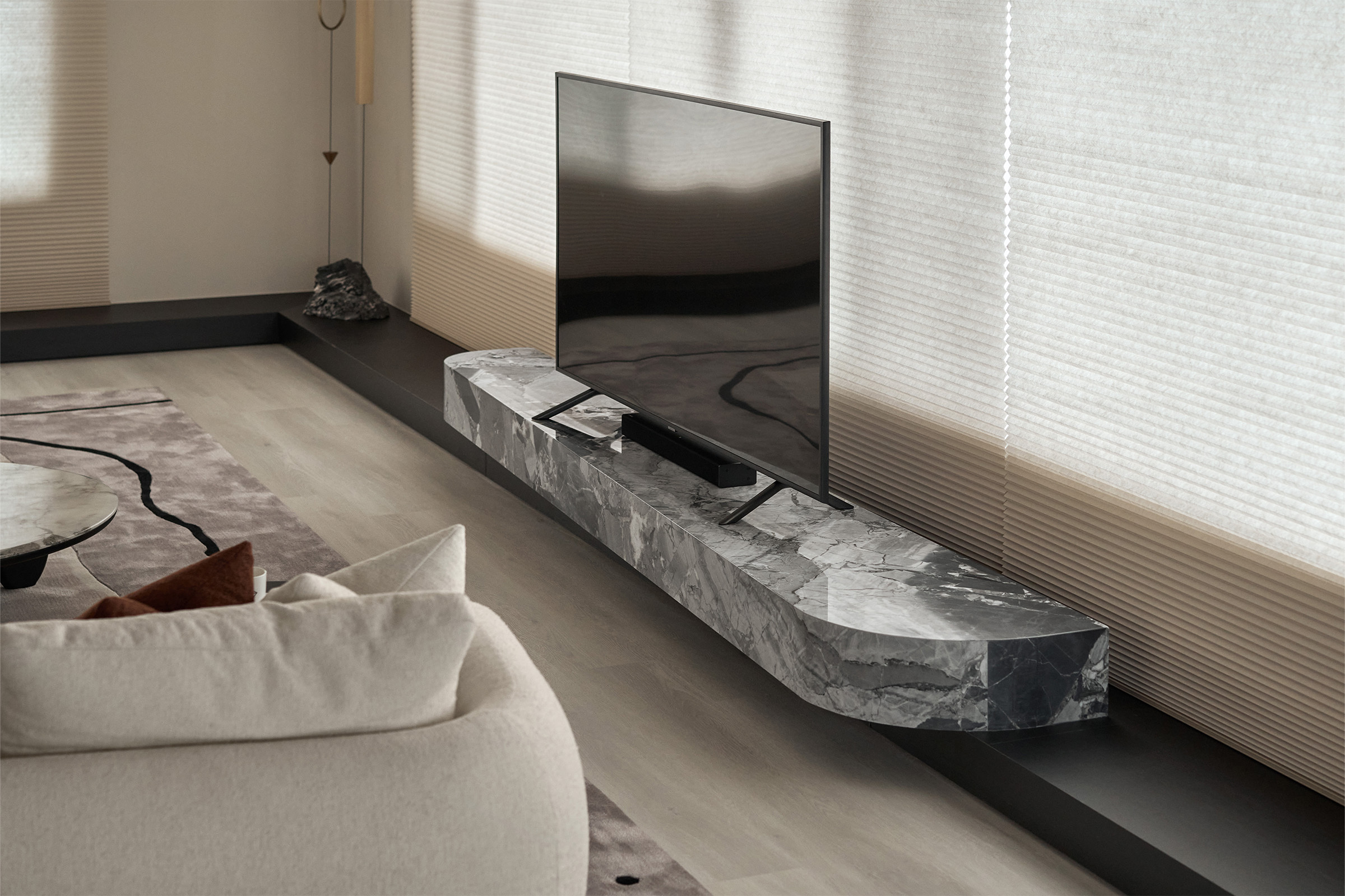 電視櫃搭配地台設計,讓空間氛圍更聚攏,深色木紋搭配訂製大理石檯面,沈穩大氣呼應著空間異材質搭配。