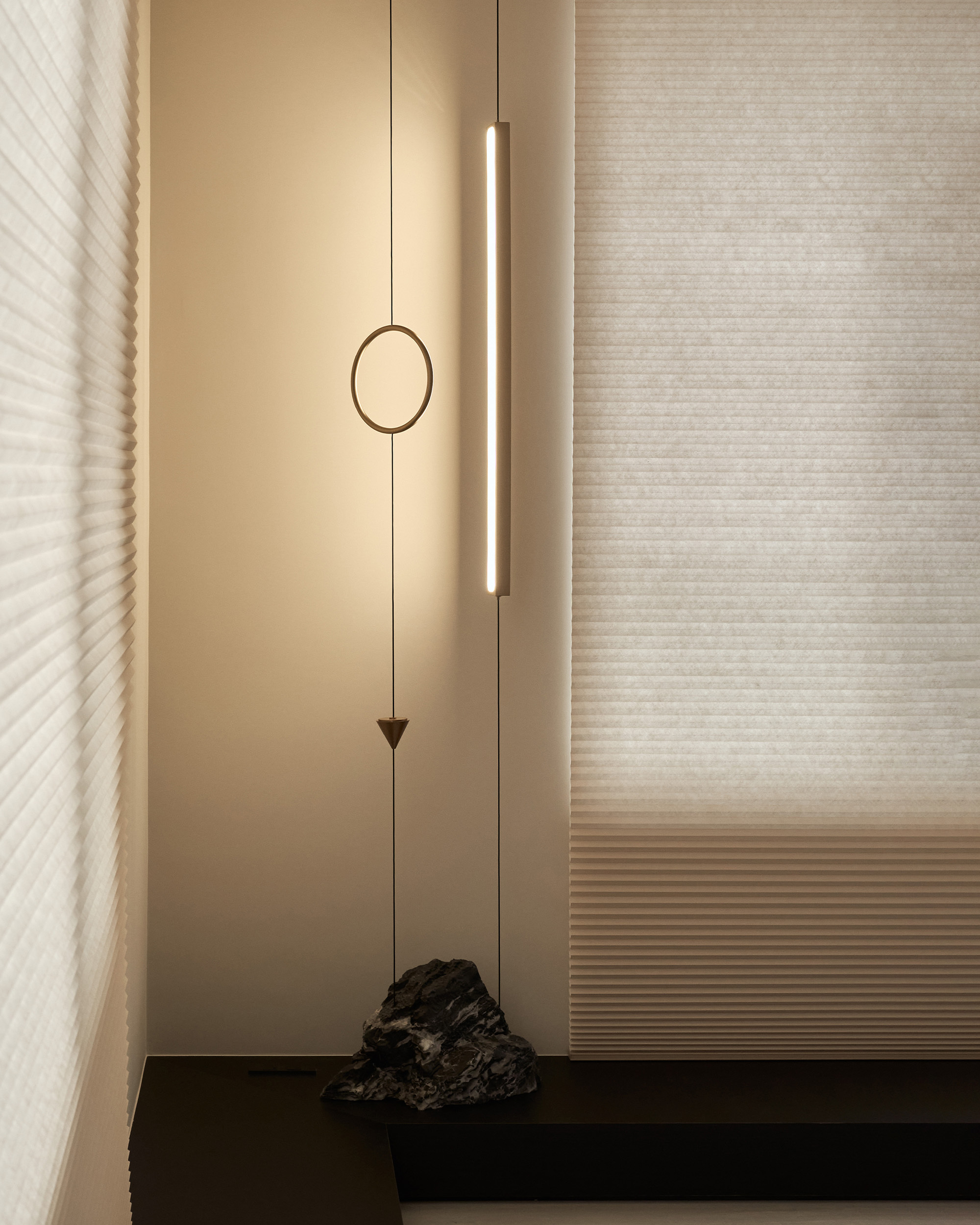 客廳一隅的訂製落地燈,以風化石與金屬材質呼應窗外的山景河景,在自然與光影間,從屋內牽引著視線朝窗外流淌的河景延展,綠意盎然的風光如畫,每個時刻都有獨特的詩意。