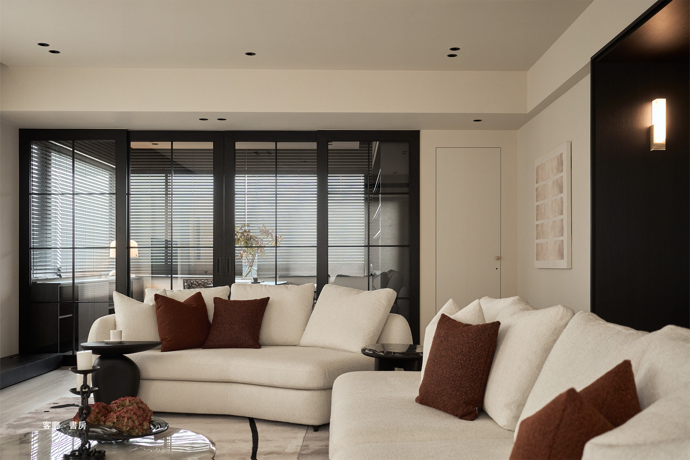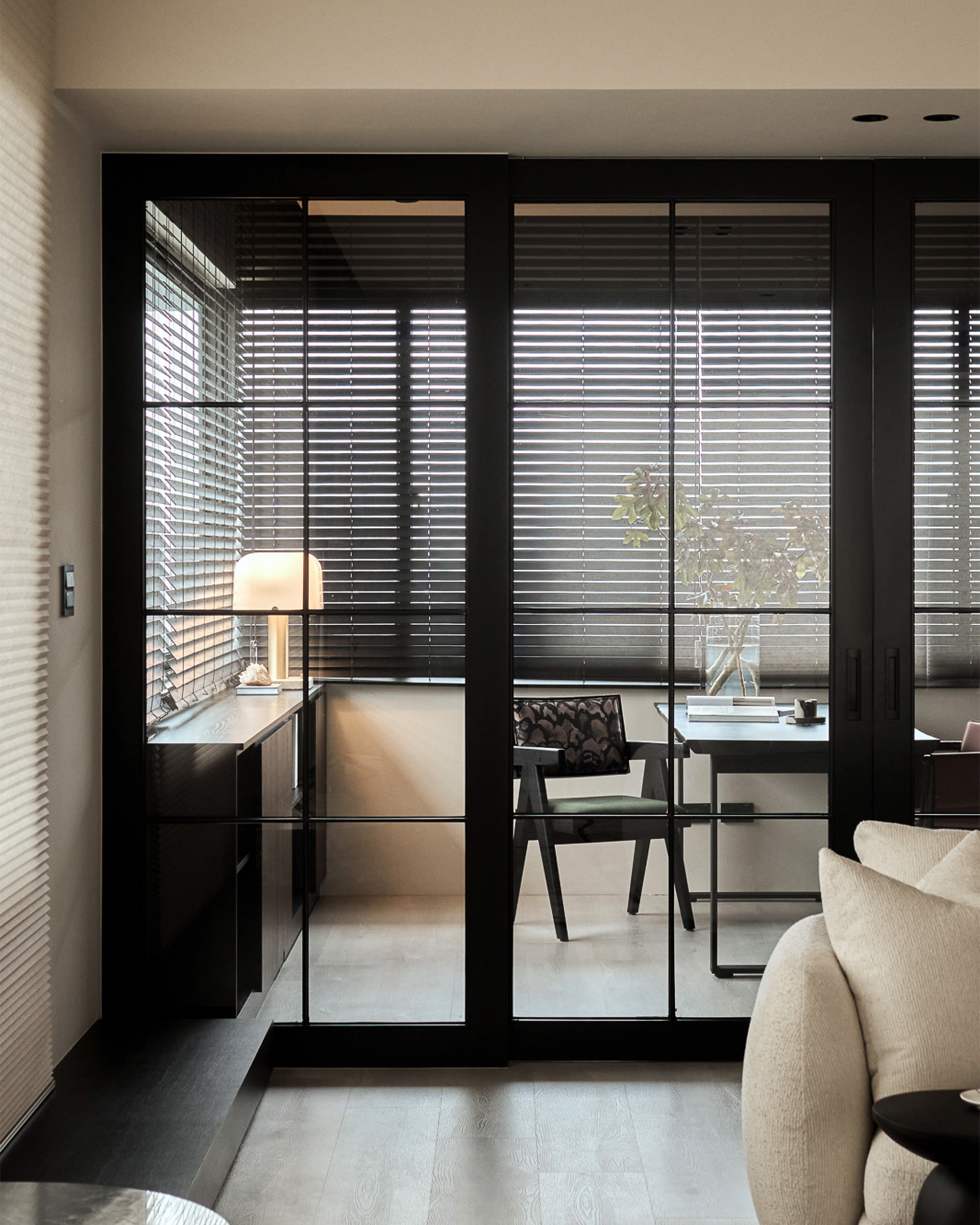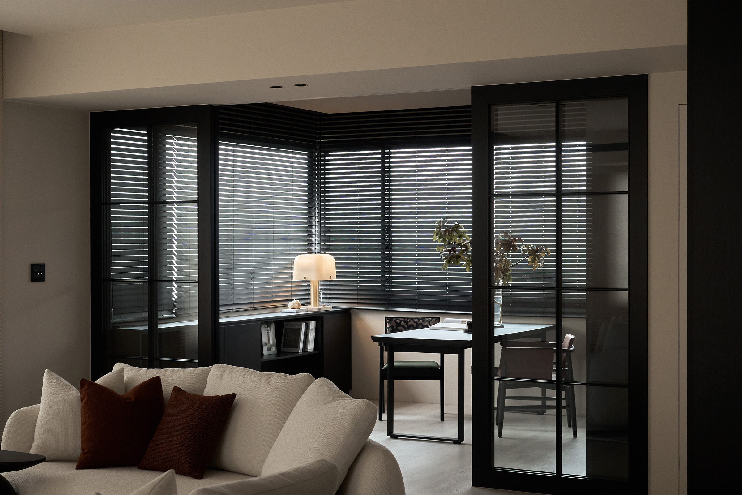 以玻璃門框劃分書房與客廳,打造視覺穿透感,又不失通透開闊。黑色書櫃與仿木百葉簾搭配,從視覺到觸覺都散發溫潤魅力,為書房注入沉靜與秩序感。