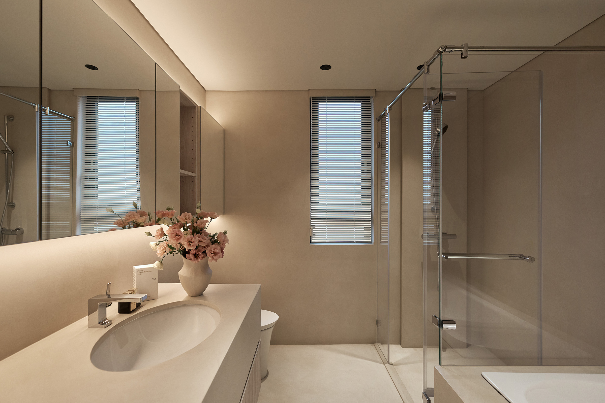 主衛浴保留了原建商的衛浴設備,以特殊塗料重繪氛圍的靈魂,工程中先拆除所有設施,再細膩的一一復位。增加鏡櫃與洗手檯的收納設計與整體風格渾然天成,於水汽氤氳間,放鬆身心靈的安適。