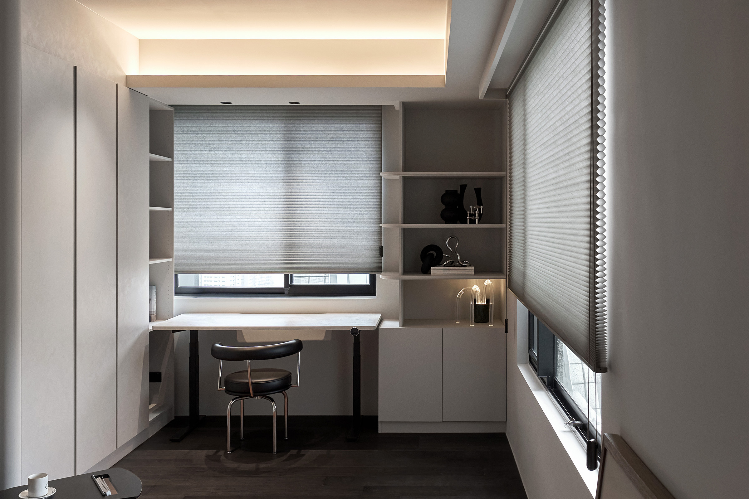 簡約是靈感的最佳夥伴,屋主兒子的工作室,以大量收納櫃體規劃,為每一件思緒與創作預留妥善的歸處。