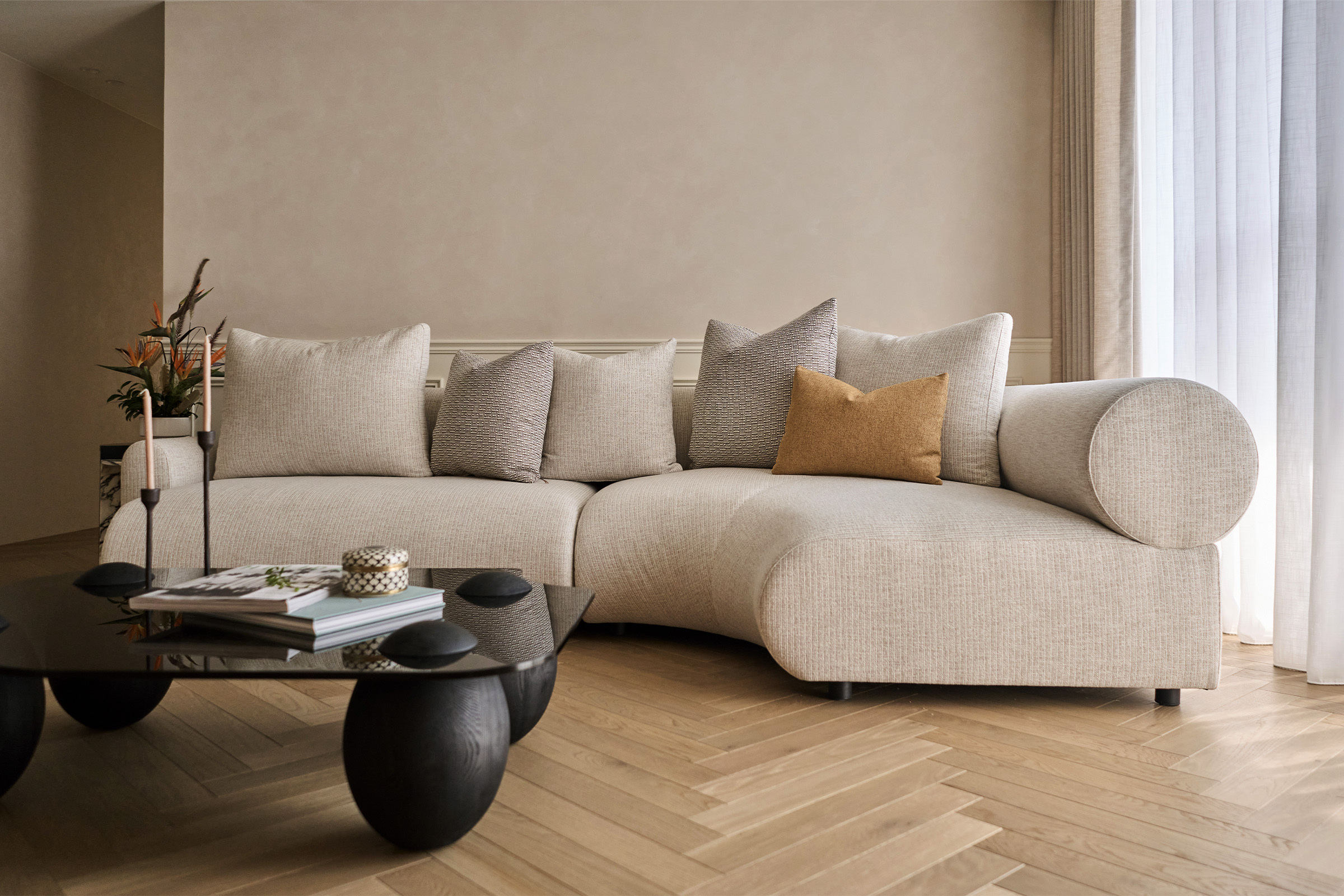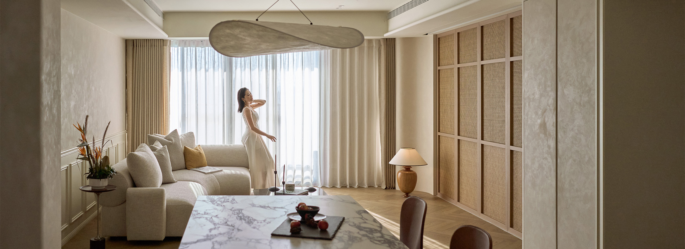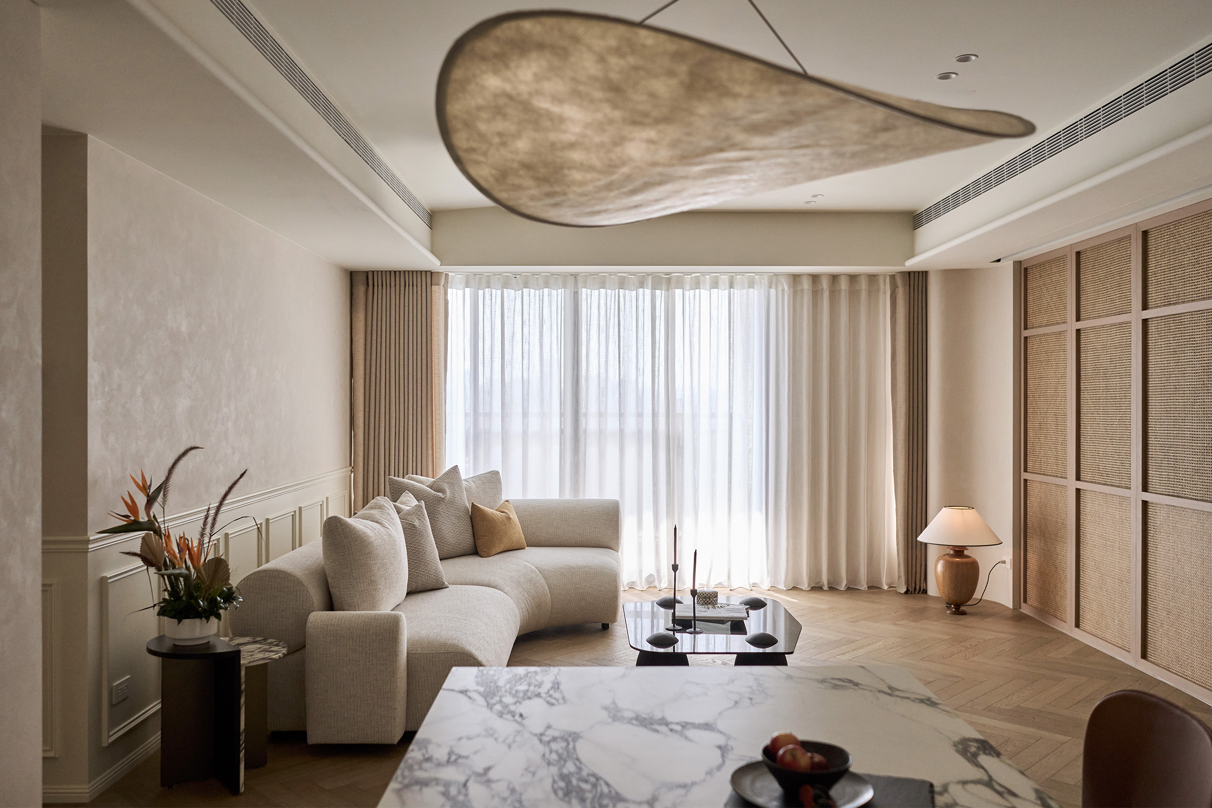 選用英國進口布料的淺色沙發,如一片靜謐的雲輕柔地擁抱著生活的日常。垂墜著棉麻材質的窗簾,溫柔地過濾日光,與藤編門片互相輝映,增添自然質樸的韻味,讓整個空間有了溫潤且清新的呼吸感。