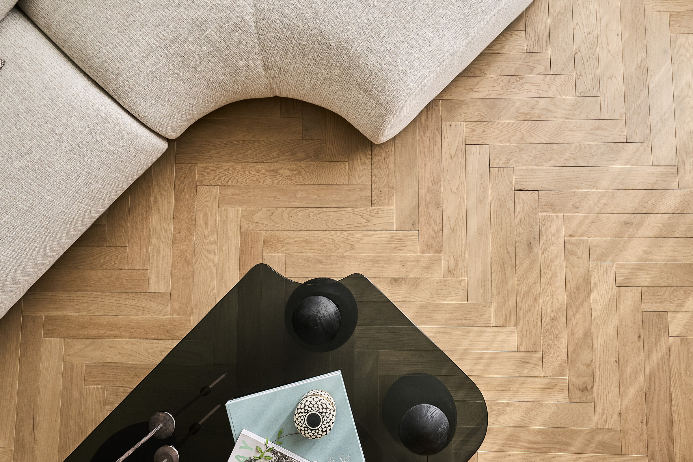 法式線板與實木人字拼地板相互交融,貫穿整個公共空間,優雅細緻的線條勾勒出靜謐而優雅的格調。