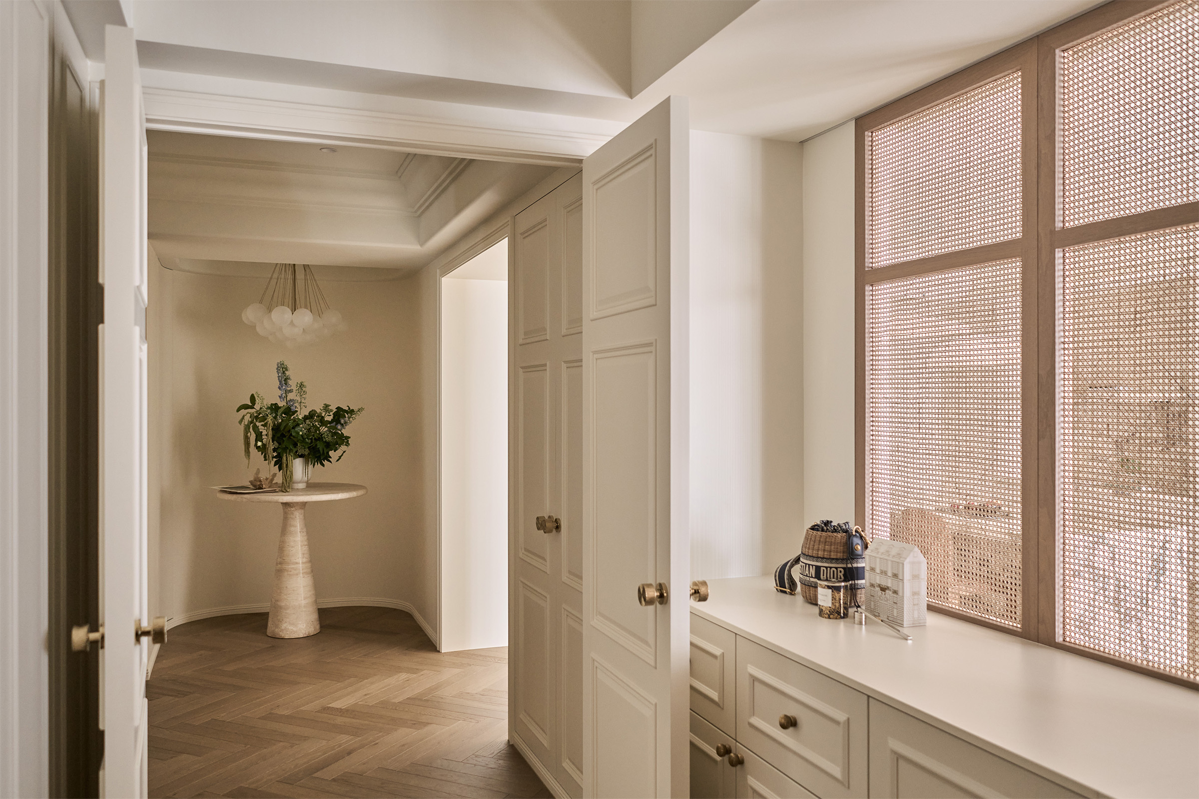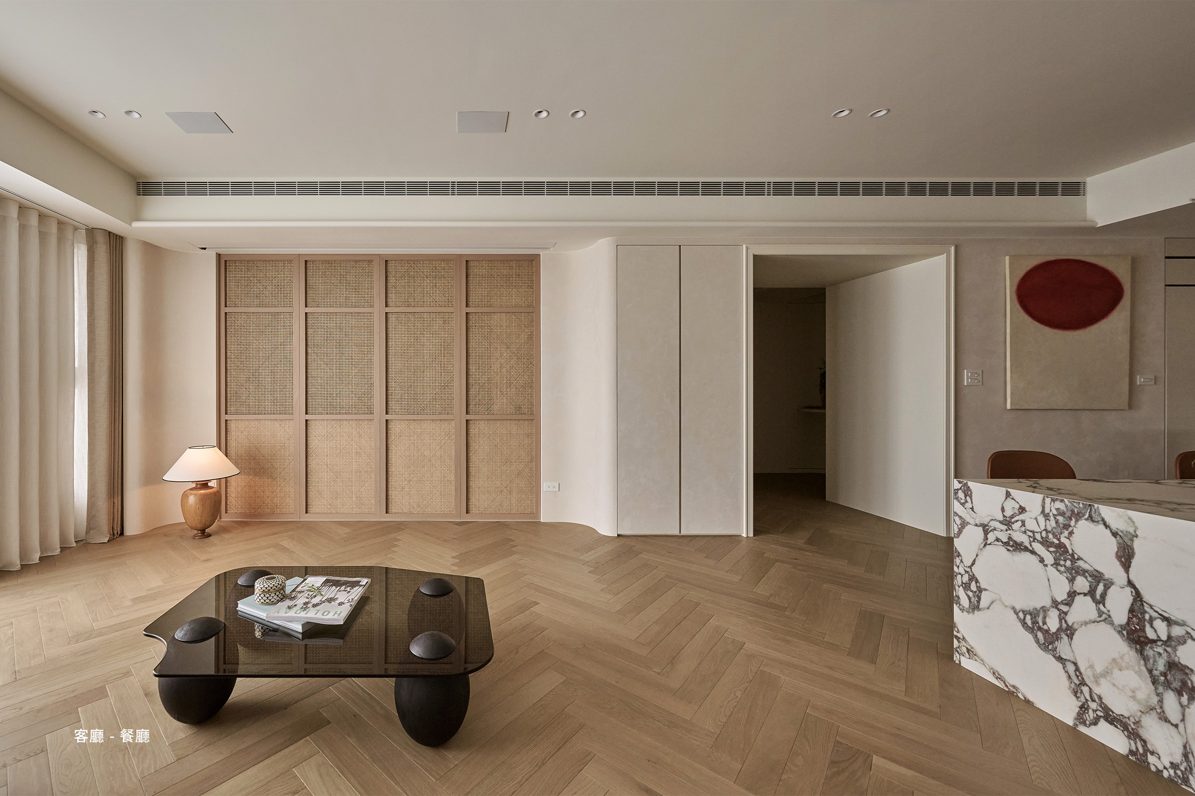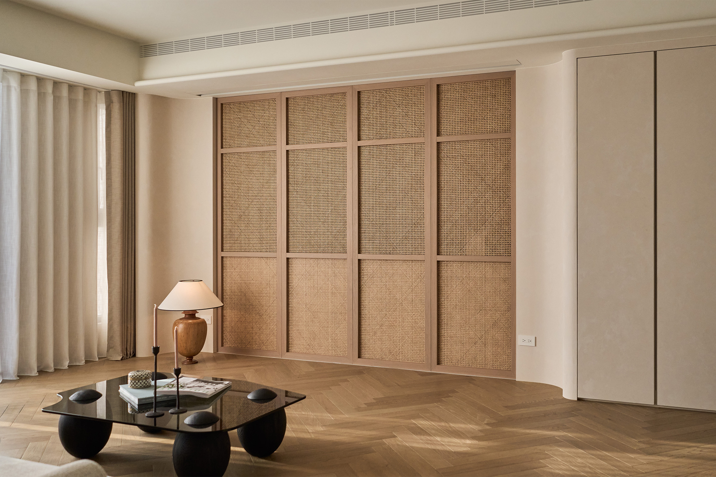 客廳與儲藏室間,以藤編門片輕柔劃分,透風透光的細緻紋理,將溫潤質感自然注入空間,與色系和諧共鳴,營造鬆弛氛圍。
