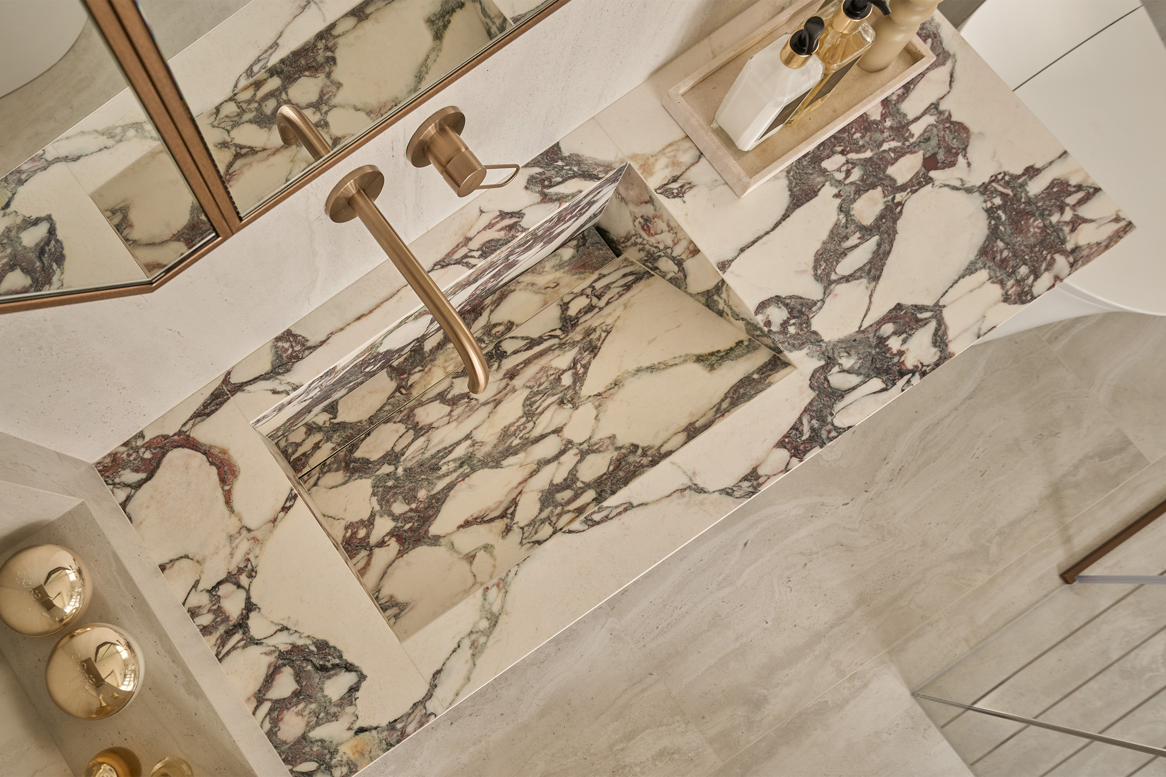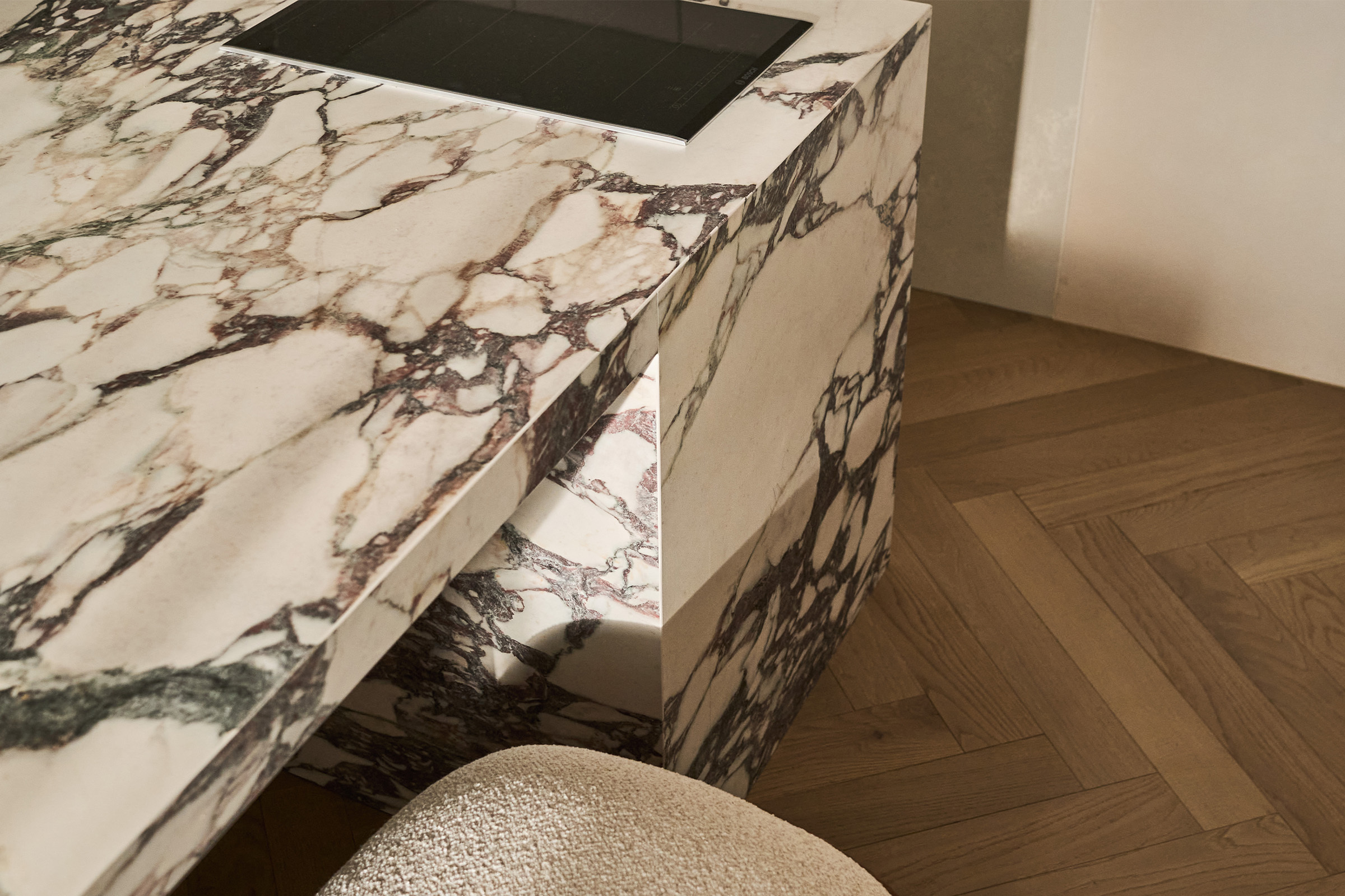 寶格麗薄板磁磚打造的餐桌,細膩的石紋交織著時間的痕跡,宛如一幅畫作,將自然的精華與人造的藝術完美結合,成為空間裡不可忽視的靈魂所在。