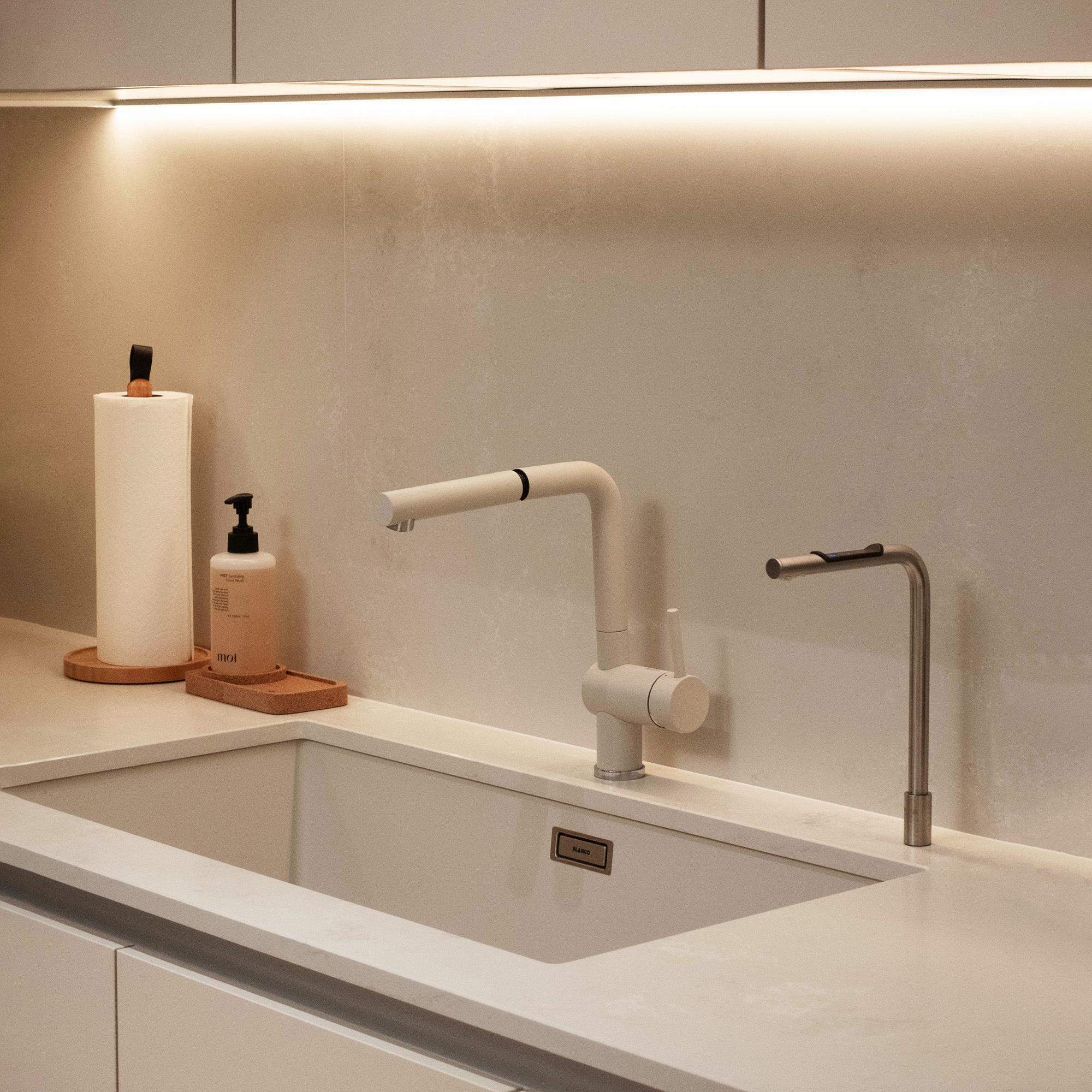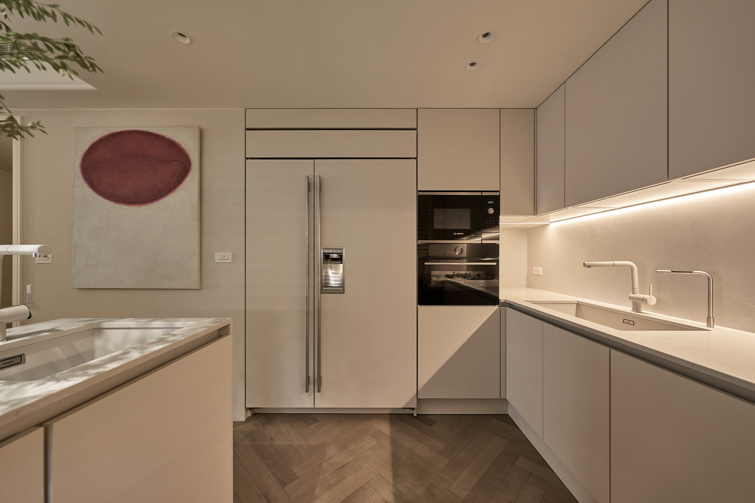 從SUB-ZERO雙門冰箱,一抹清涼在指尖流淌,帝雉石檯面如同永恆的山巒,堅韌卻溫潤,統一色系的Poggenpohl廚具系列結合BLANCO水槽與龍頭,將設計與功能以優雅的姿態相互融合。而垃圾桶的隱藏式設計,也為空間留白,予以簡潔的美學。