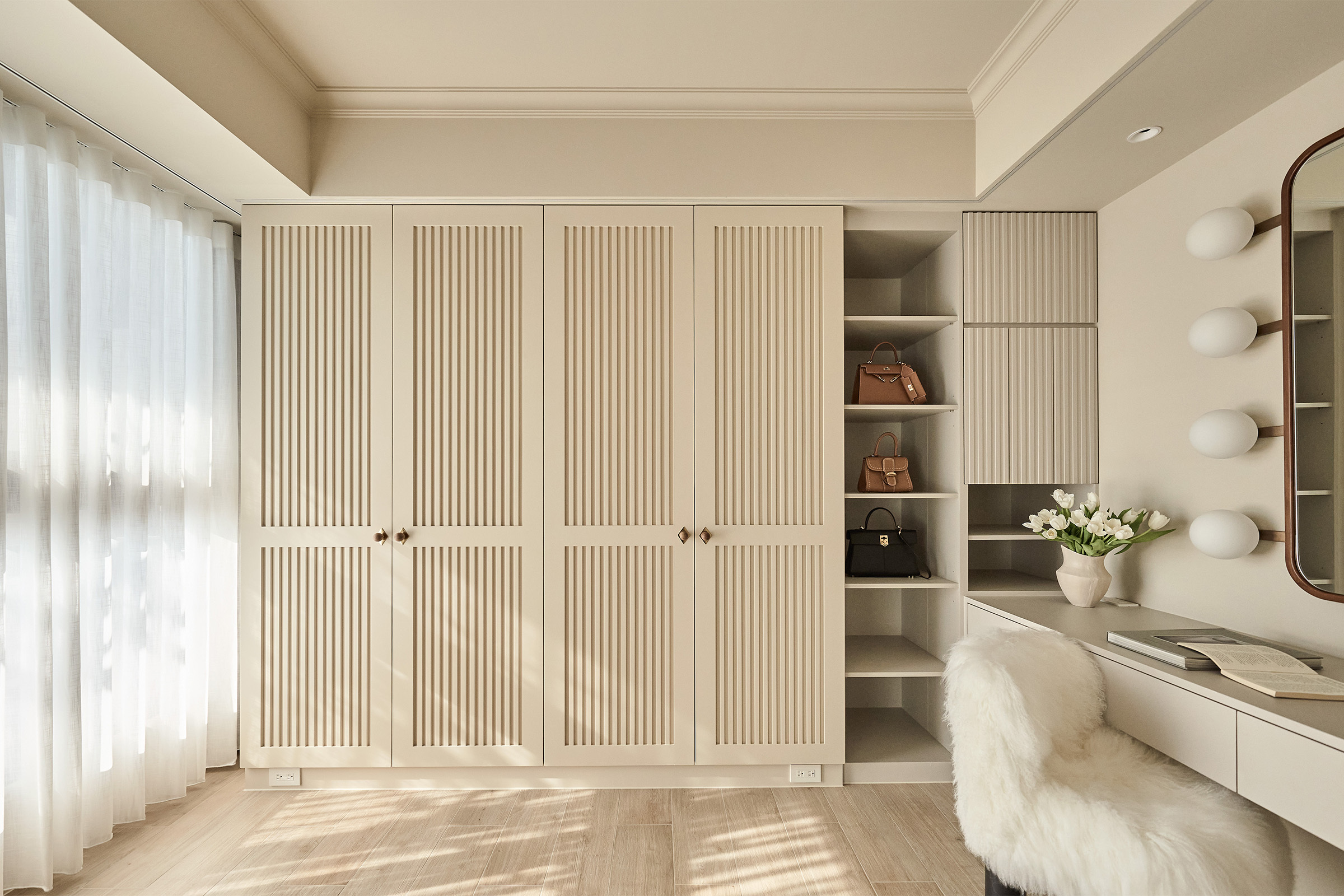 衣櫥的隱藏式全身鏡,方便穿搭不占空間,符合風水鏡面不照寢,為心留一片寧靜。