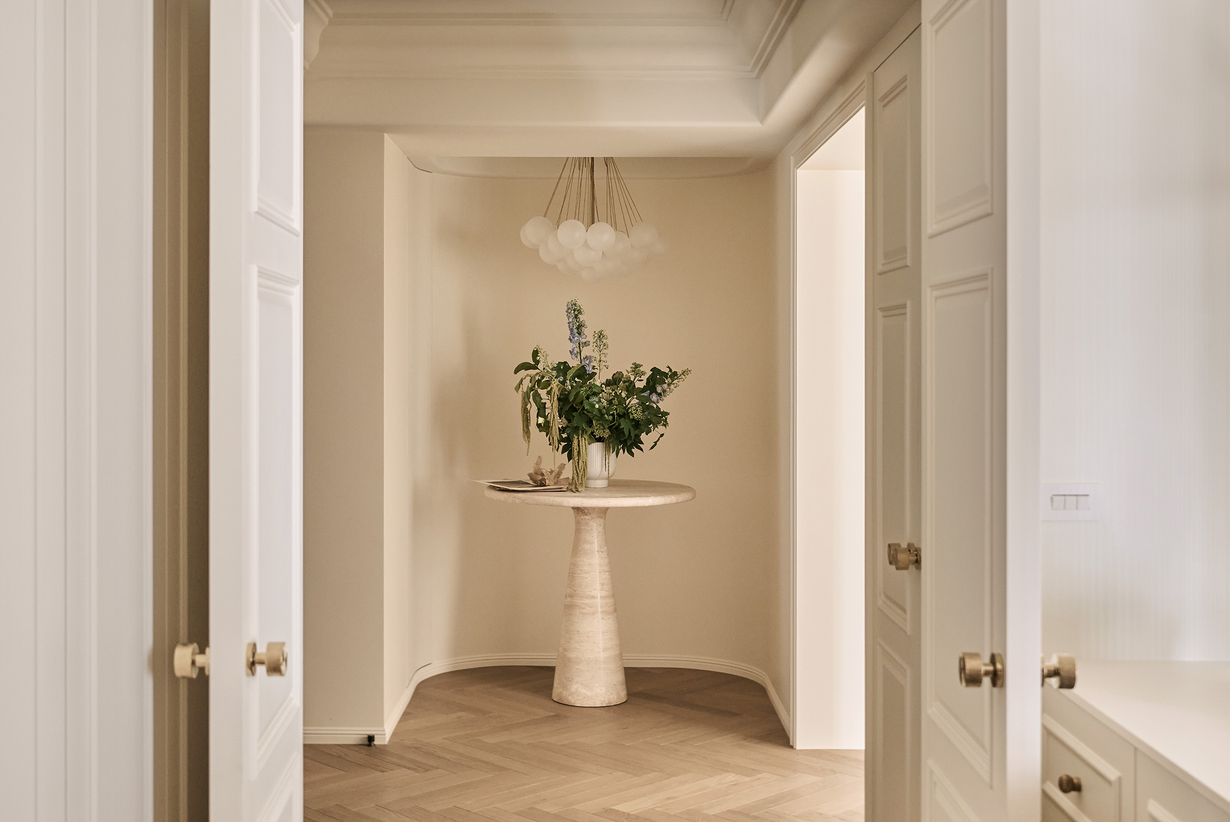 溫潤的天然洞石圓桌,點綴著精緻花藝,這唯美視覺的玄關,讓人一進門便開啟家的儀式感,置身於屋主精心描繪的美學詩篇裡。吸引目光從圓弧天花板由上而下,欣賞這流暢曲線打造的獨特端景。