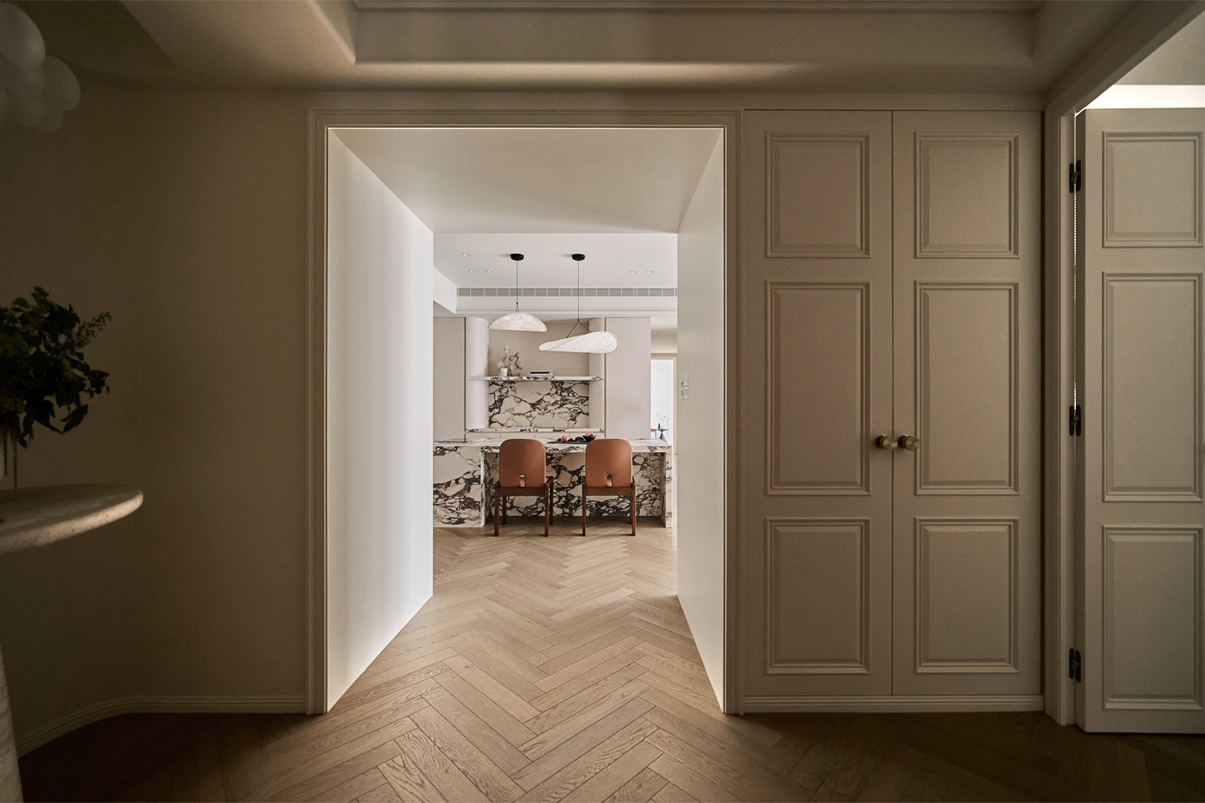 每一步都在細膩木紋的鋪陳中游走,帶出沉穩且內斂的品味,讓空間自然流露著法式風韻,隨光影變化映照出溫暖的質感。