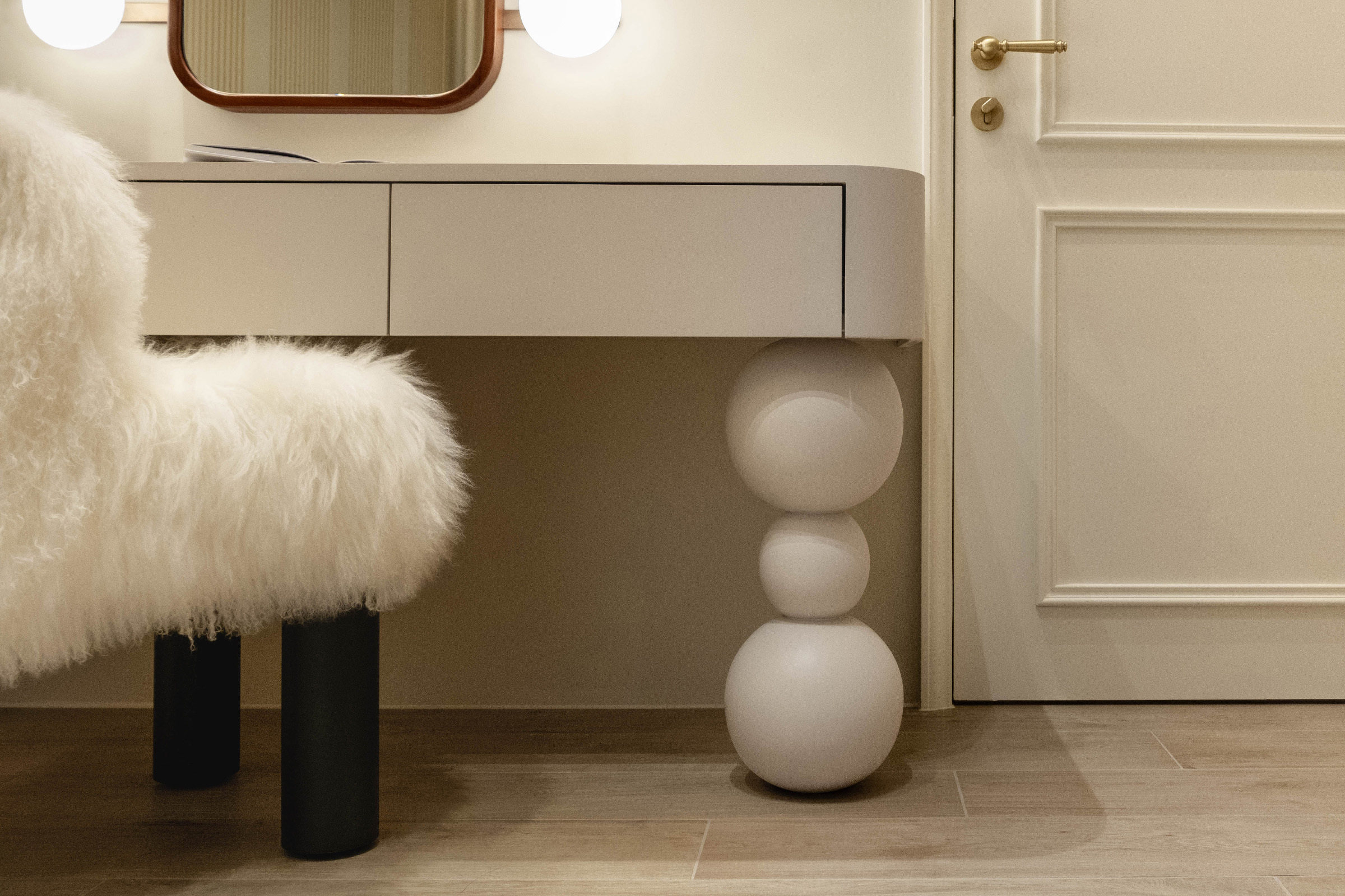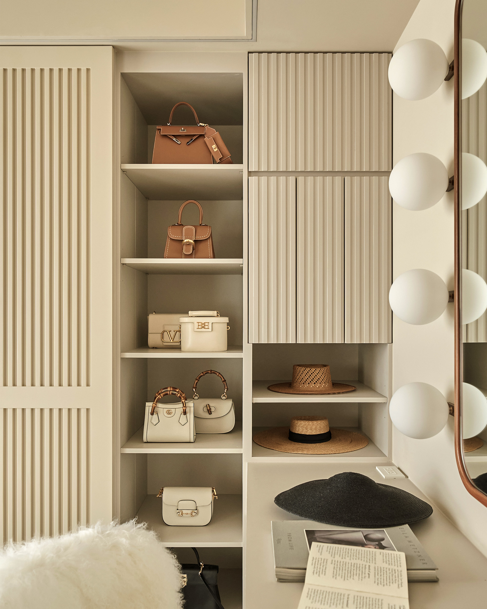 透明玻璃隔層的收納櫃,清晰展示每件珍愛物品,化妝台旁的高抽屜設計,整齊收納彩妝品。