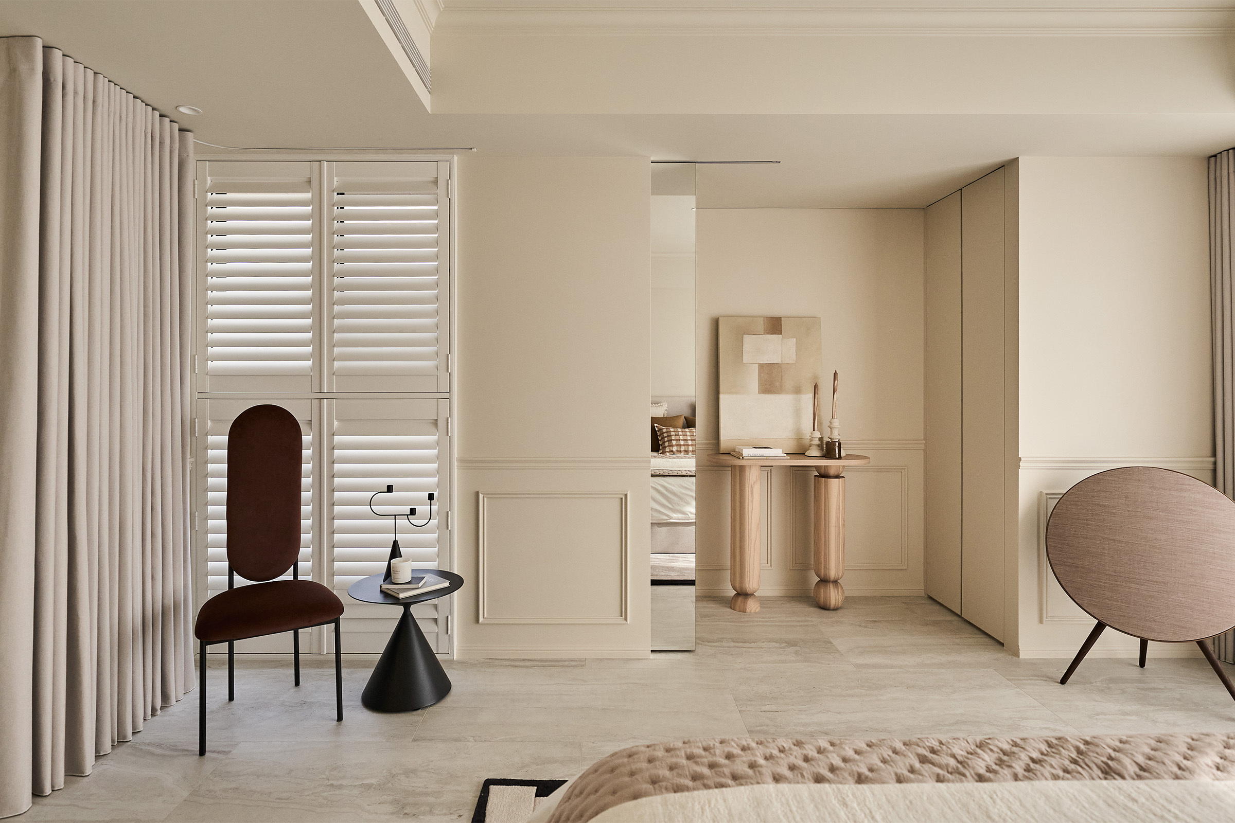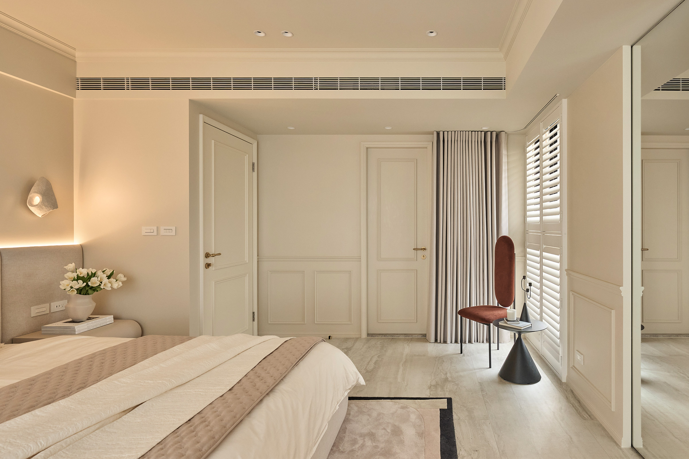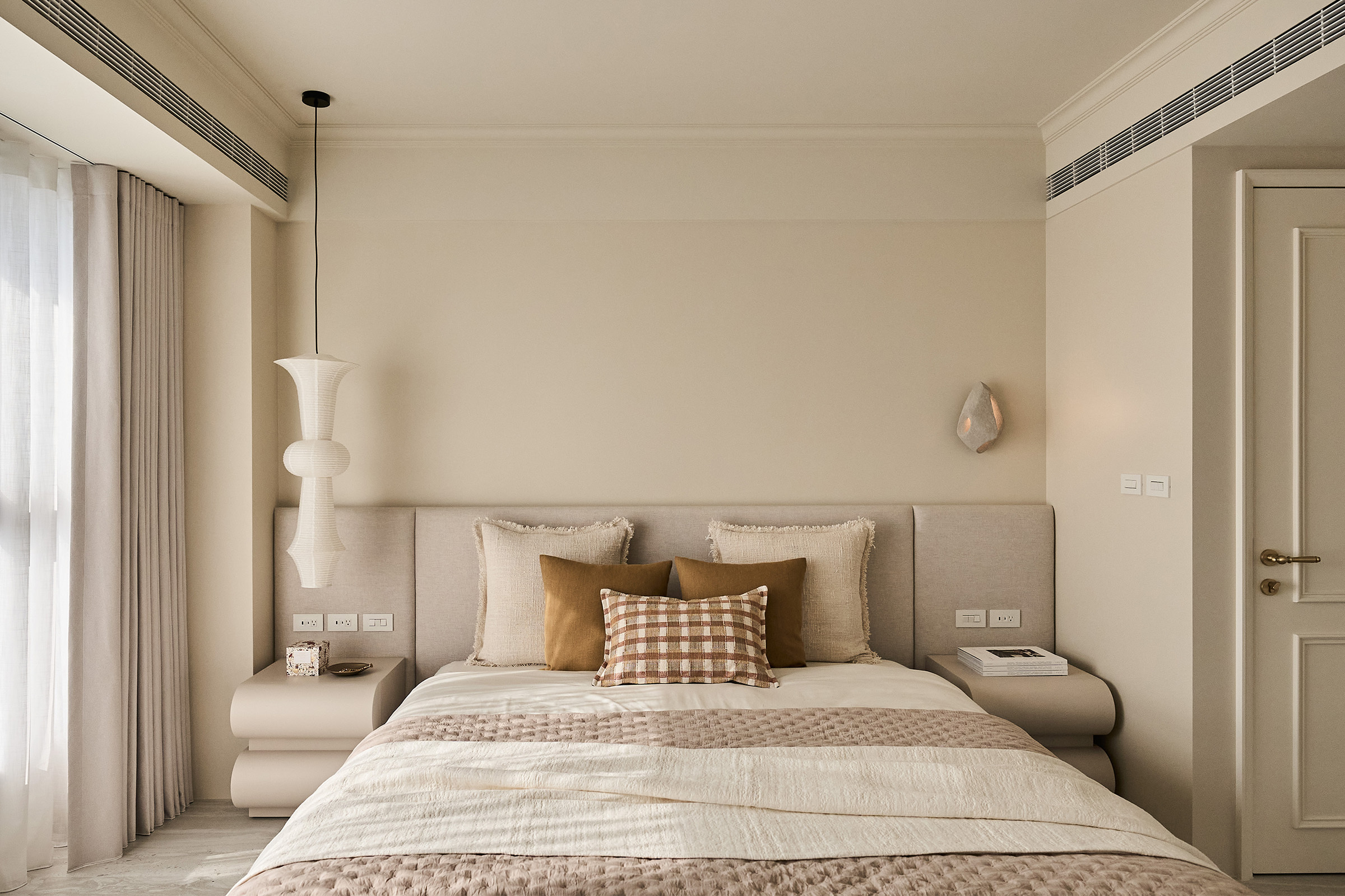 主臥整體設計回歸簡約本質,以舒適為核心,寧靜的色調包裹住每個夜晚,讓人沉入一場溫柔好眠,靜享一室安恬。