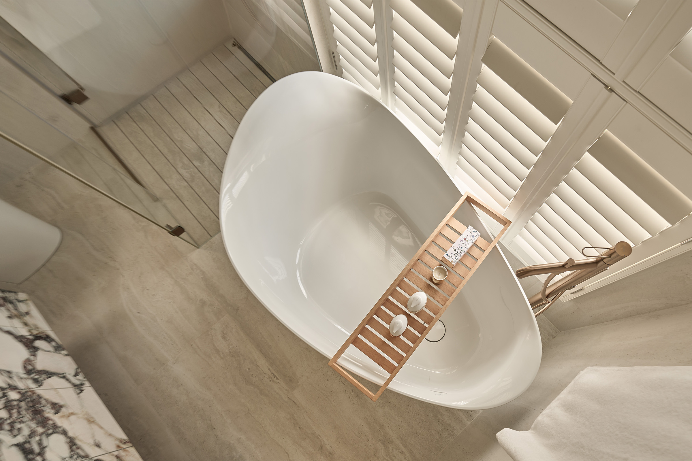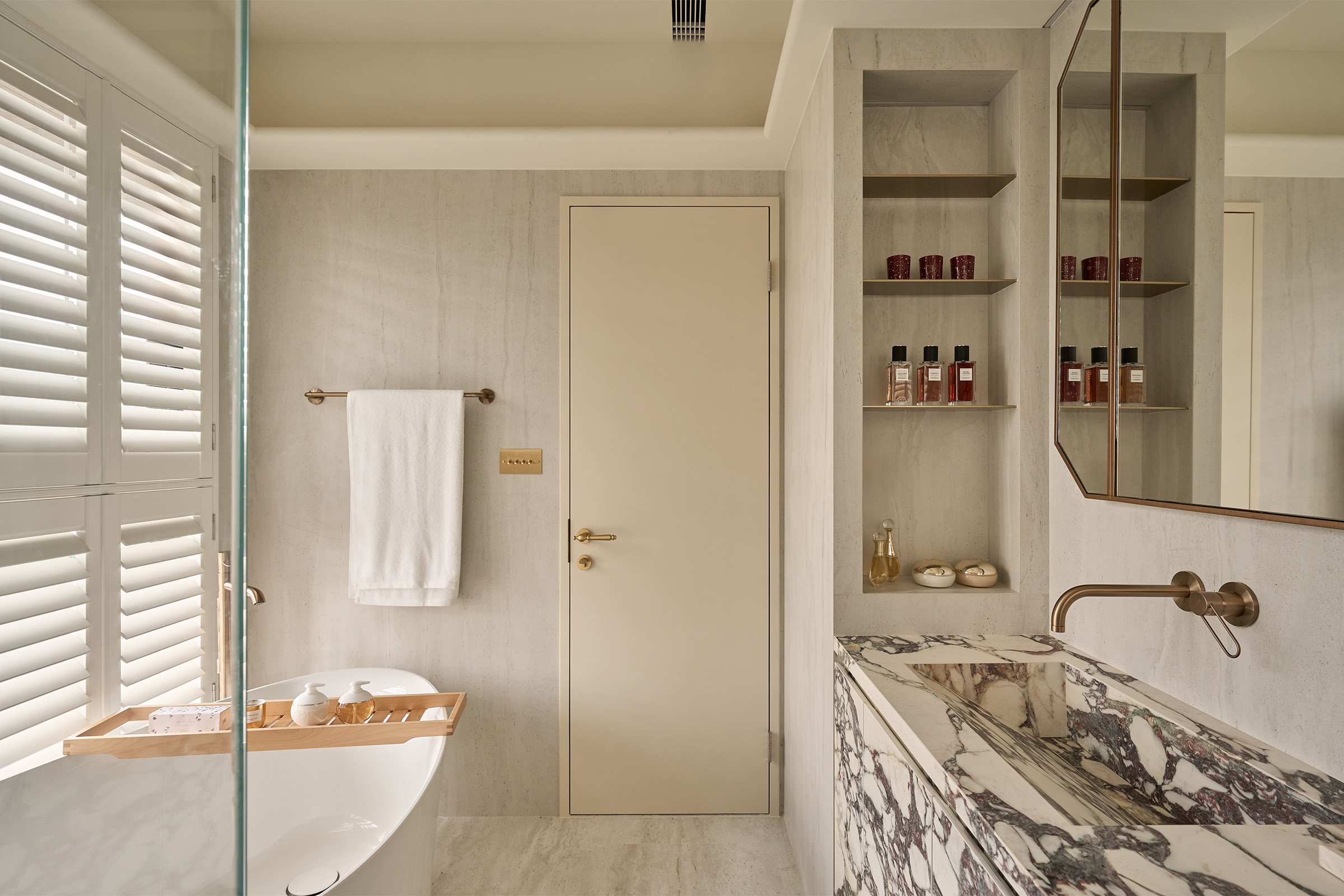 百葉窗柔和調光,帶來明亮氛圍同時兼顧隱私。三角弧形浴缸,如彎月般流暢的曲線宛如一件藝術品,置身其中,仿若泡沫輕撫,恍若人間仙境,洗去一整天的疲憊,留下溫柔與放鬆。