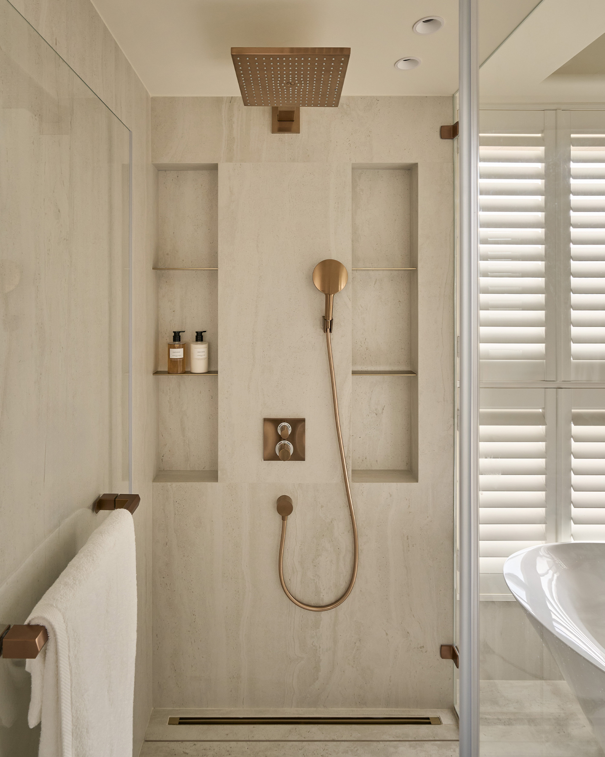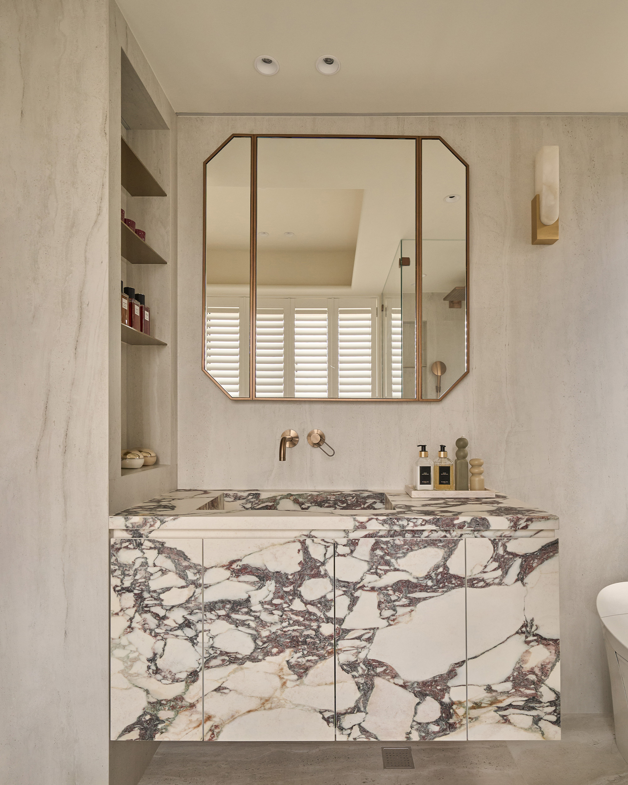 櫃下貼心設計專屬吹風機收納空間,統一層板、壁龕、掛鏡、壁燈與衛浴五金皆採鍍鈦材質色調,呈現和諧一致的視覺美感。