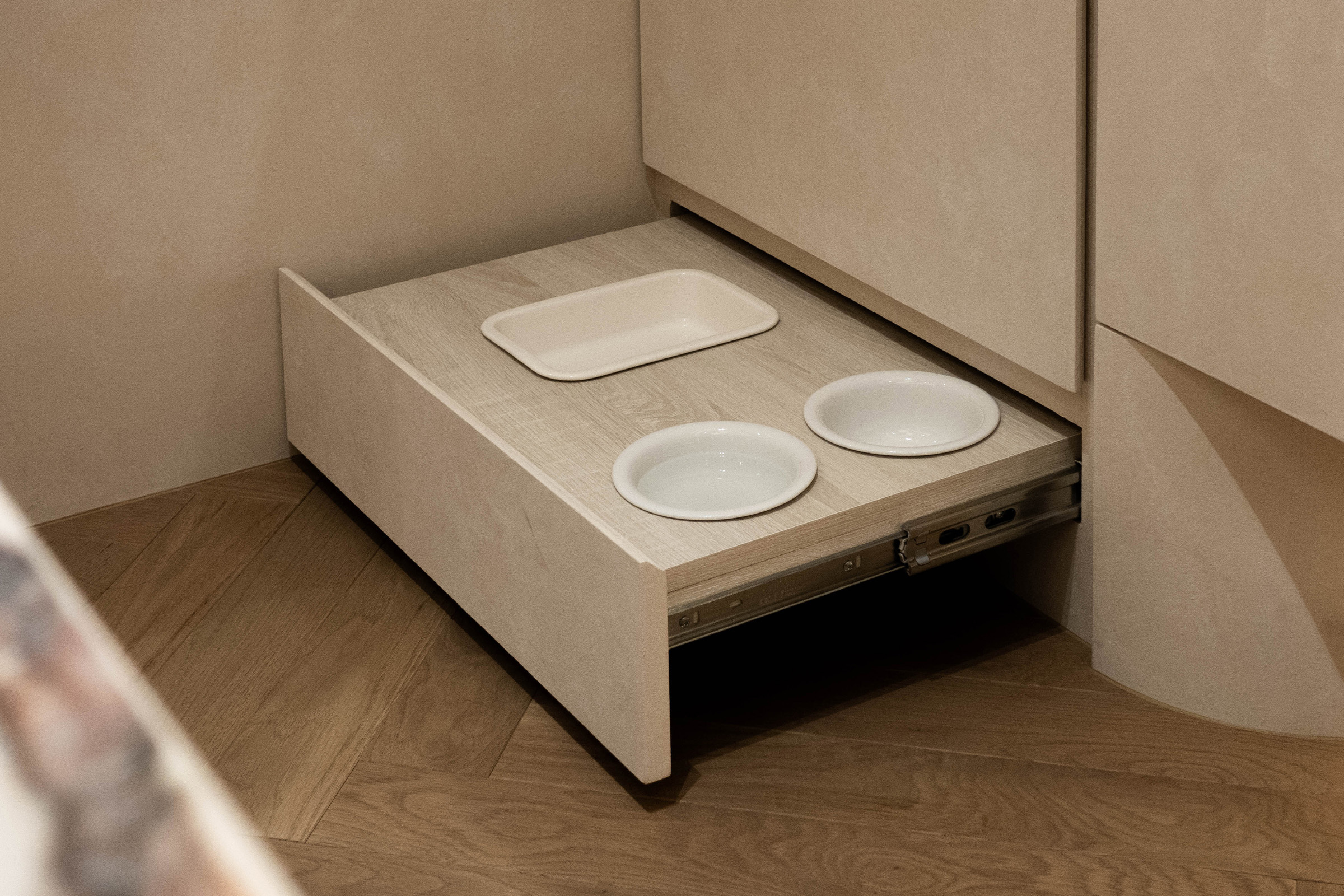 餐邊櫃貼心地設計出寵物餐盤與小家電的專屬空間,讓一切收納井然有序。